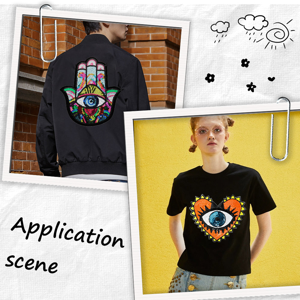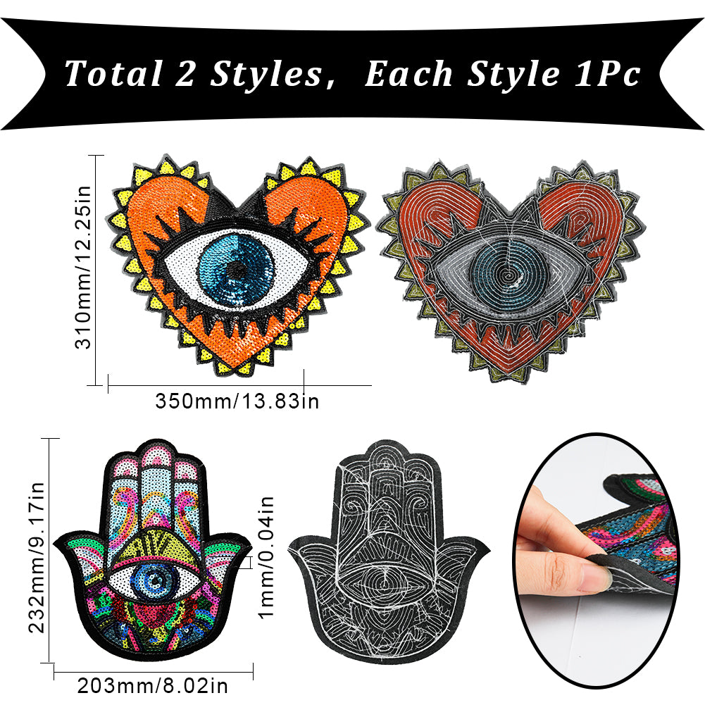 2Pcs 2 Style Computerized Embroidery Cloth Iron on/Sew on Patches, Costume Accessories, Paillette Appliques, Evil Eye, Mixed Color, 1pc/style