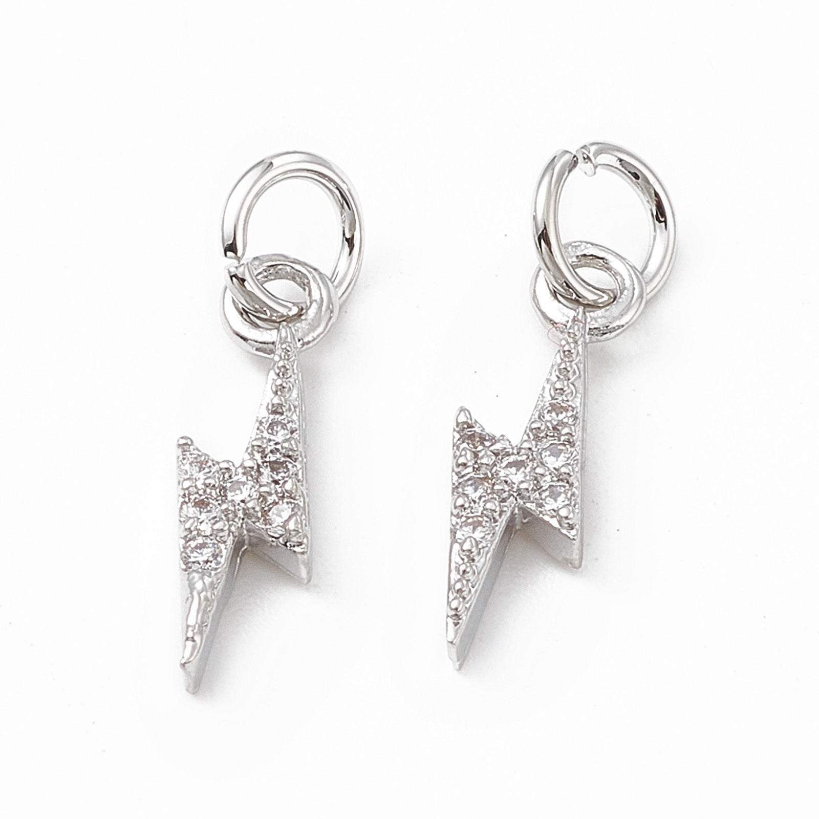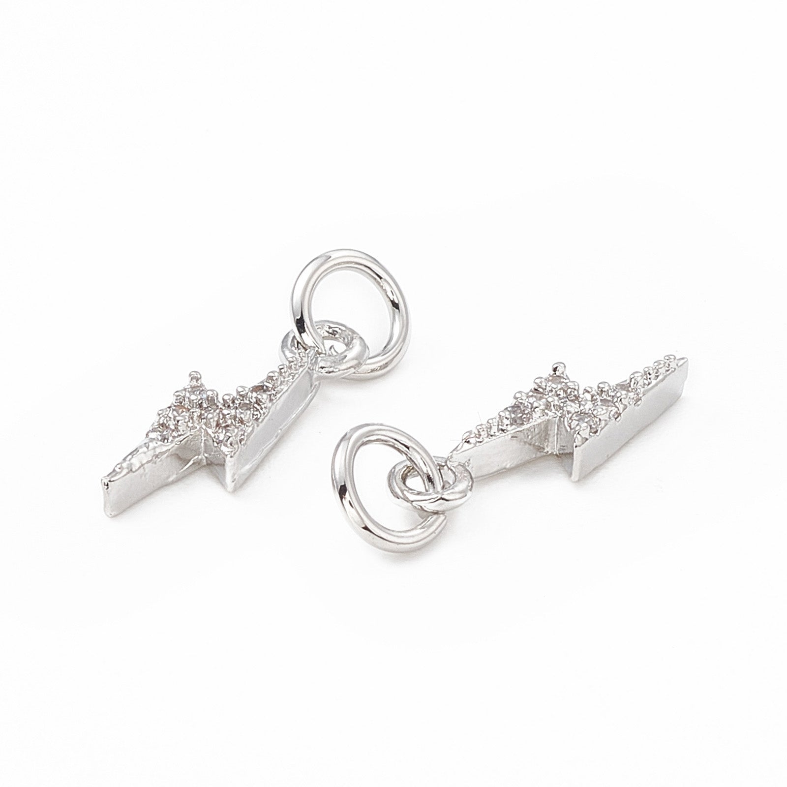 Brass Micro Pave Cubic Zirconia Charms, with Jump Ring, Lightning Bolt Charm, Platinum