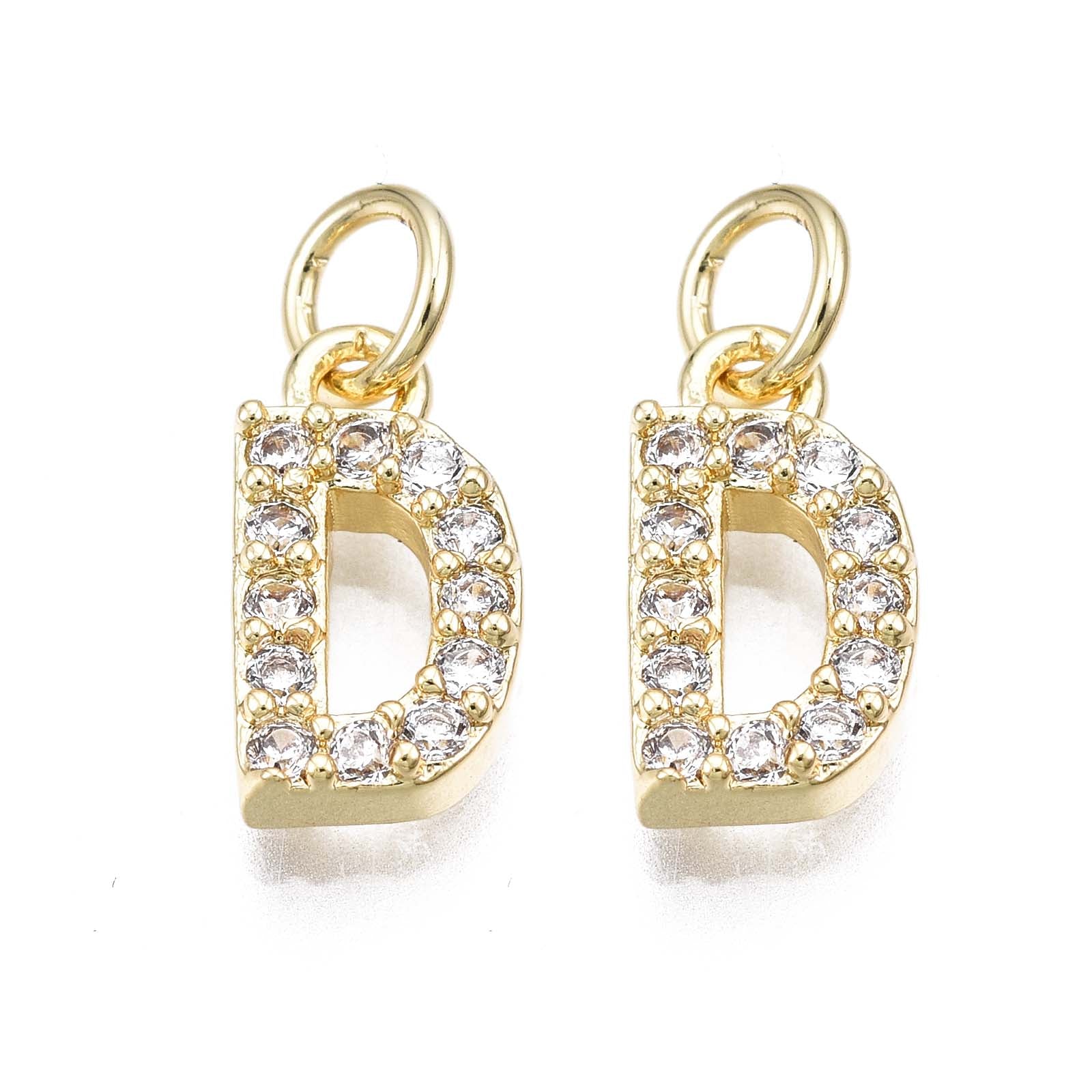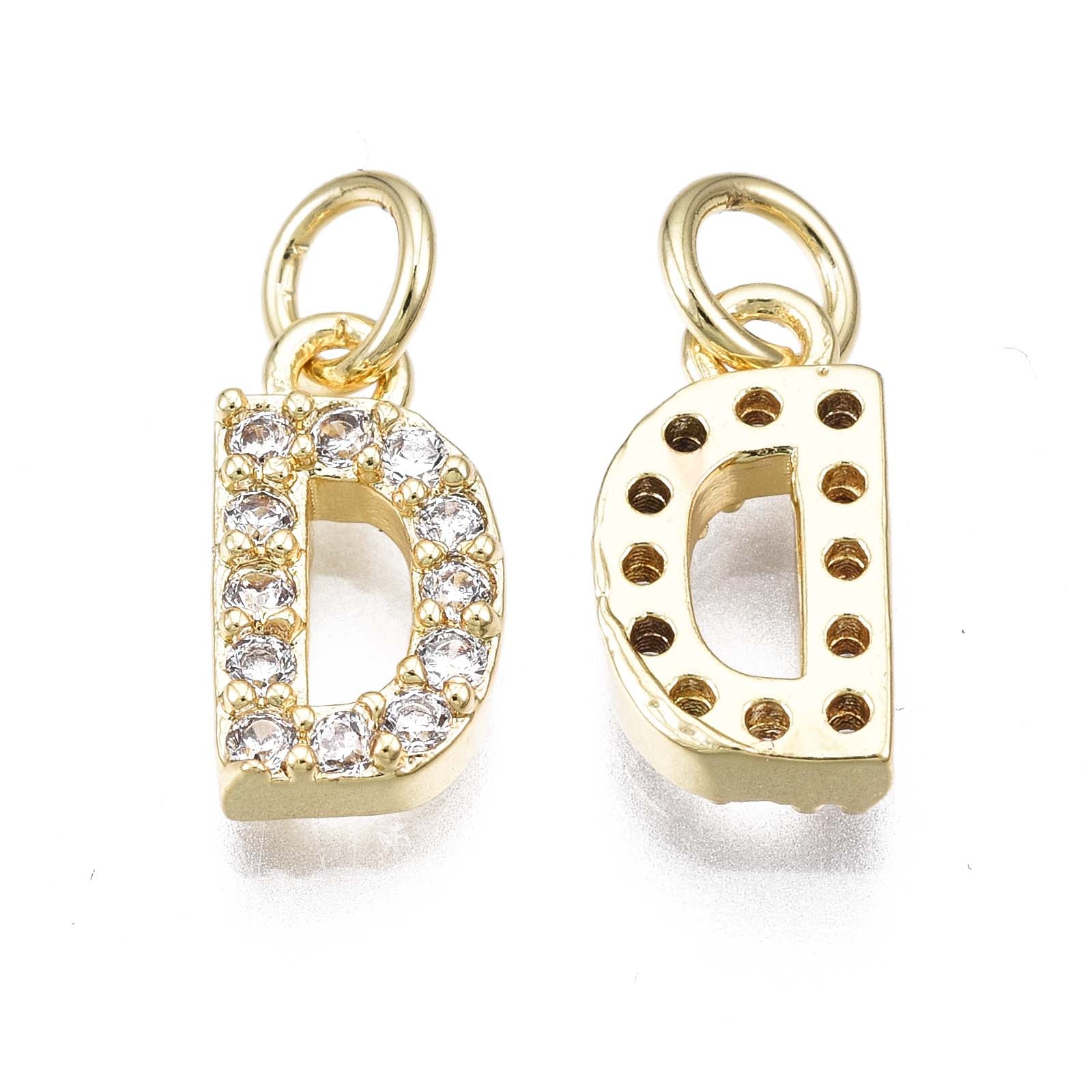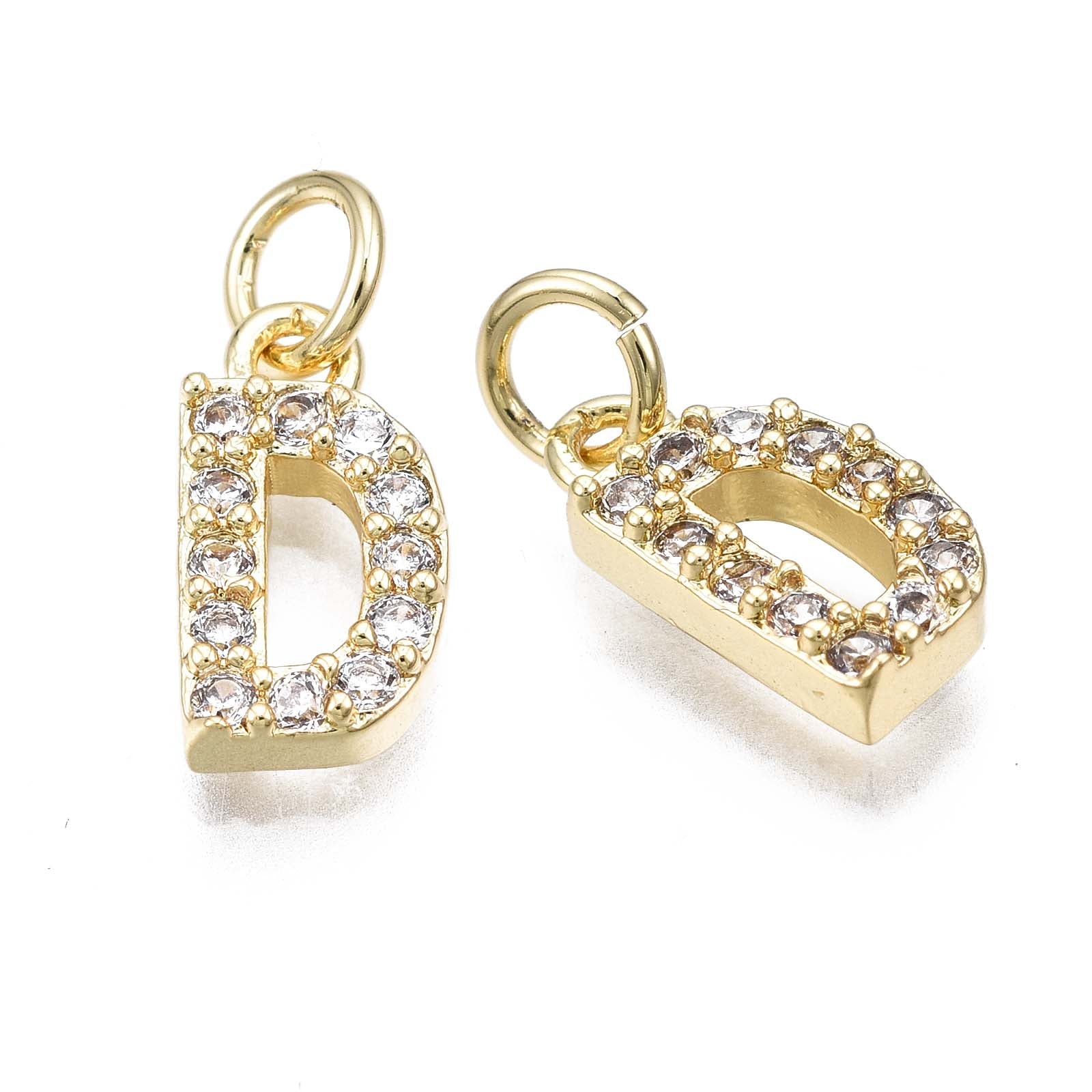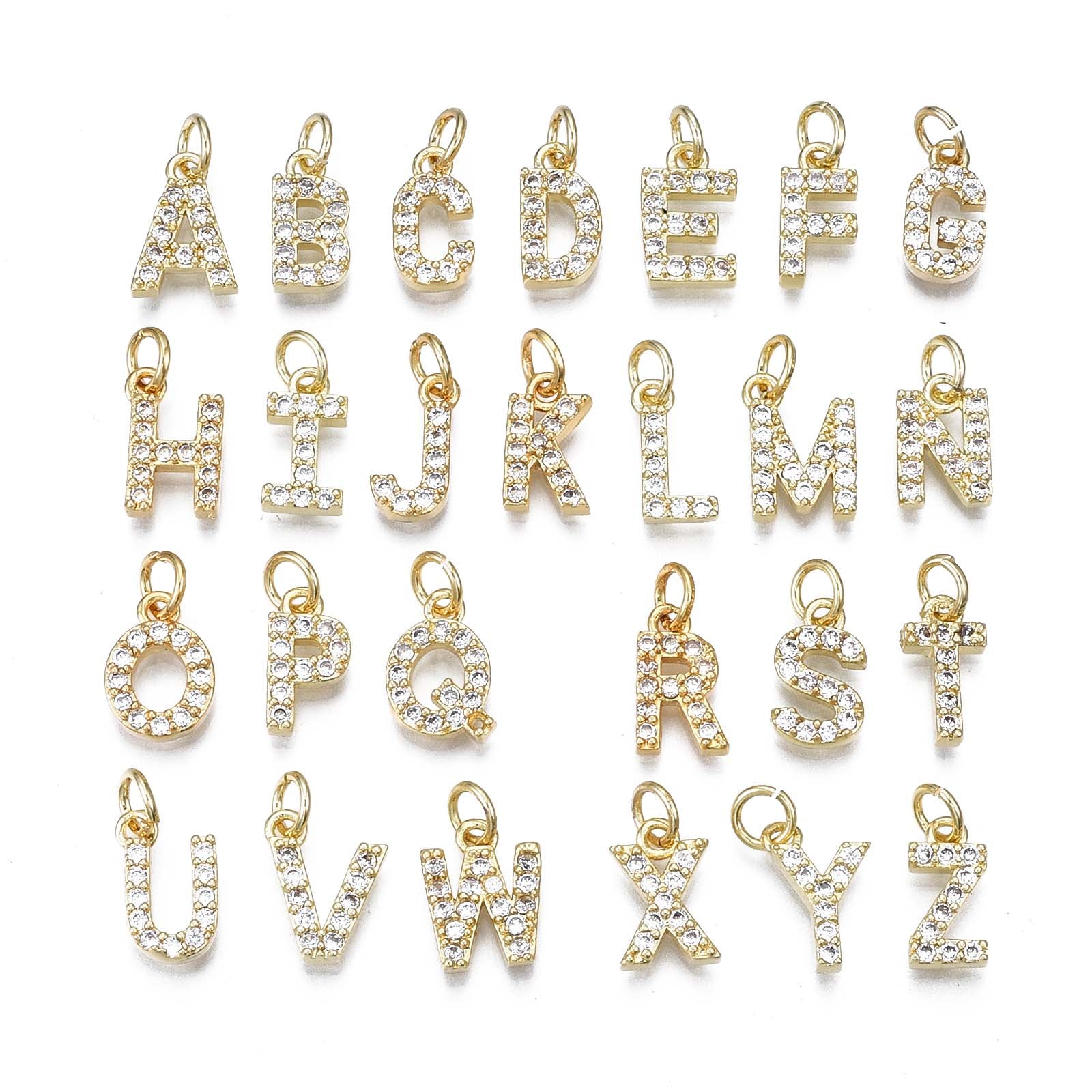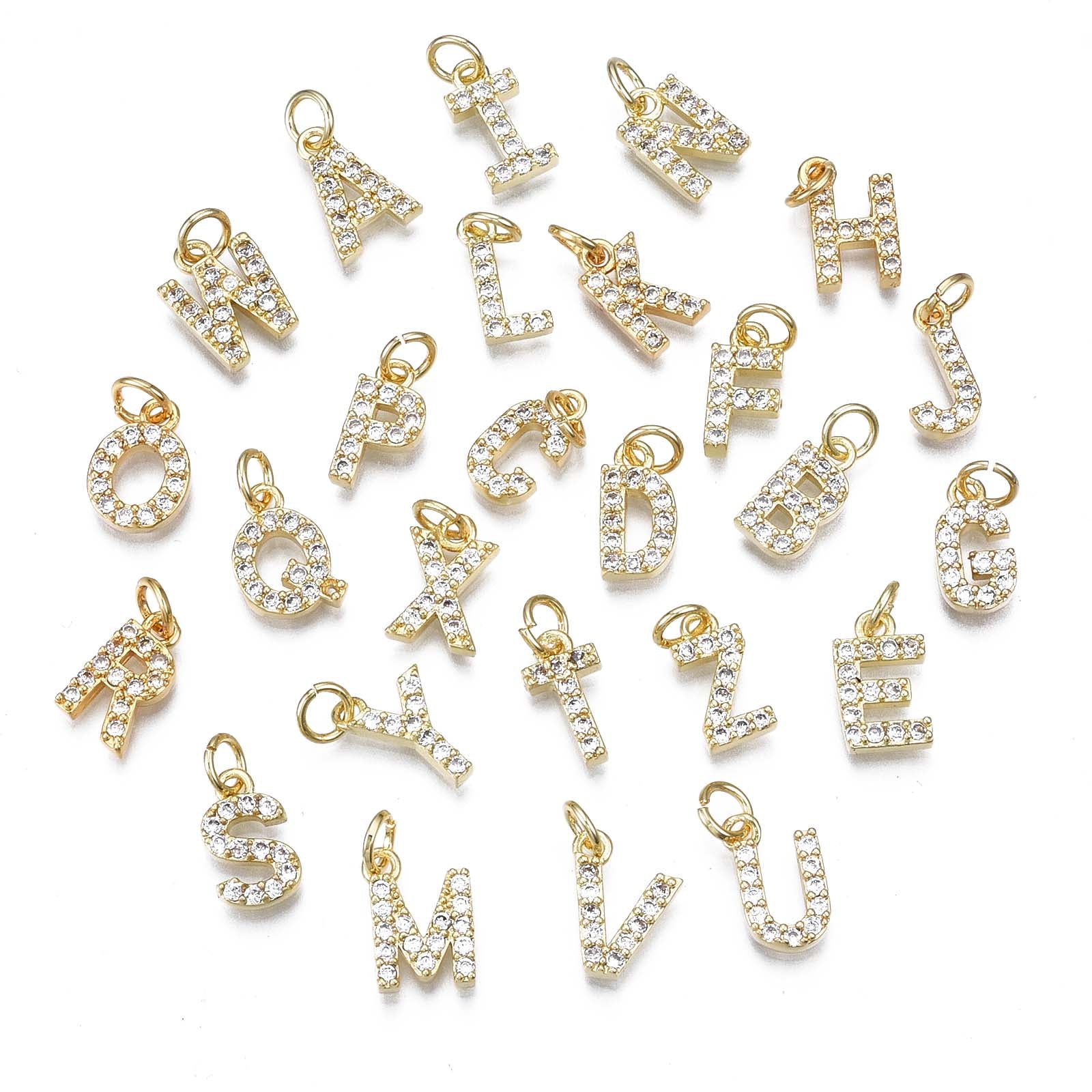 Brass Micro Pave Clear Cubic Zirconia Charms, with Jump Rings, Real 18K Gold Plated, Cadmium Free & Nickel Free & Lead Free, Alphabet, Letter A~Z, 11~12x5.5~9x2.5mm, Hole: 3mm
