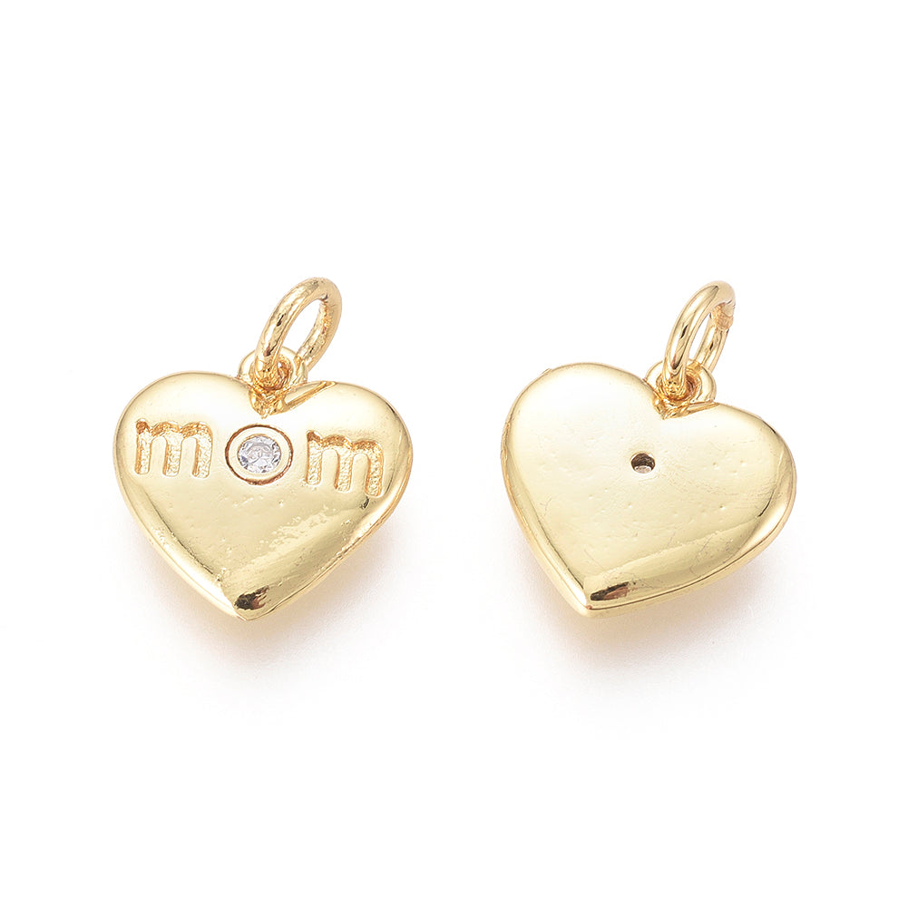Golden Plated Brass Charms, with Cubic Zirconia and Jump Rings, Heart with Word Mom, for Mother's Day, Clear