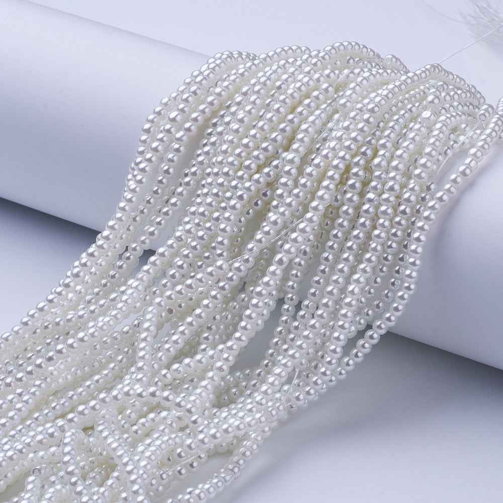 A super value. Pearlescent glass beads in long strands. Glass pearls have pastel-colored coatings and are heated for a durable finish. Economical glass pearls offer a hint of luxury at just a fraction of the cost of designer pearls. Color may vary slightly from dye lot to dye lot.