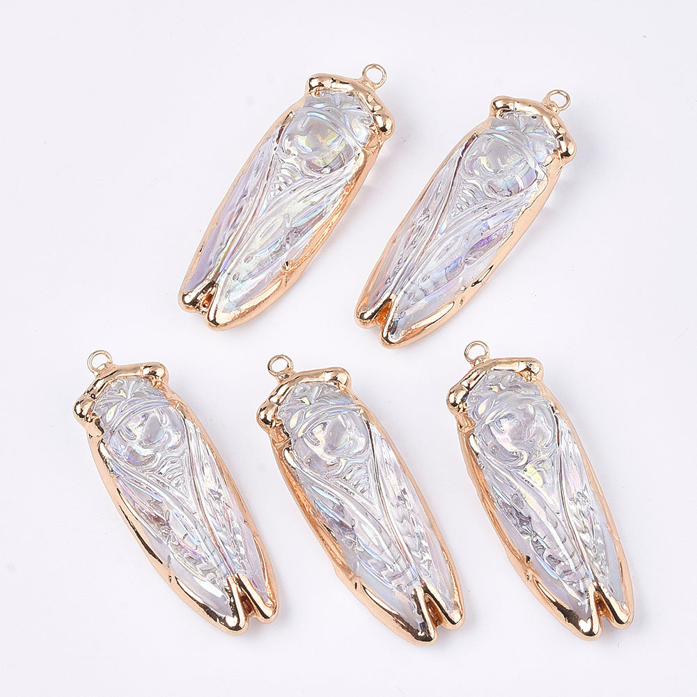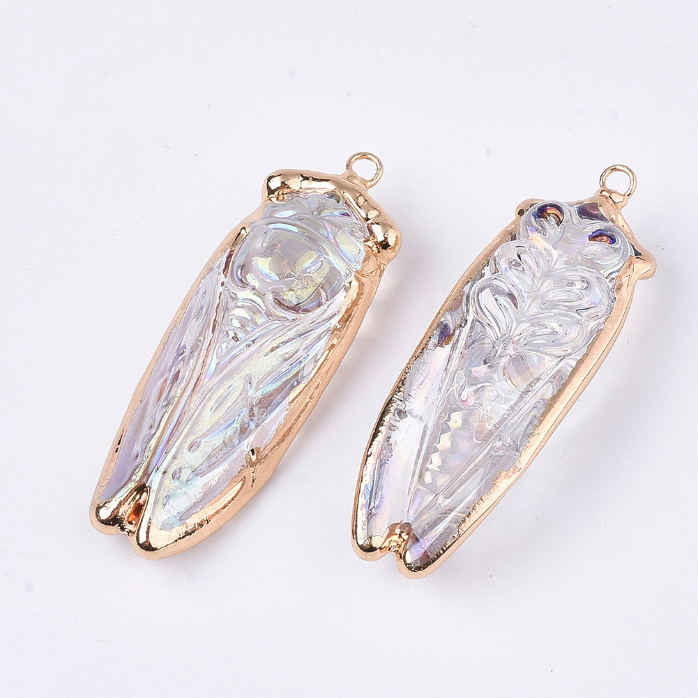 Electroplate Glass Big Pendants, with Iron Findings, AB Color, Cicada, Golden, Clear AB, 53~55x18~19x13mm, Hole: 2.5mm, 5pc/Set