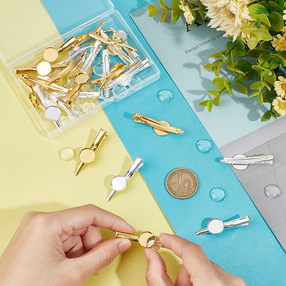 DIY Blank Dome Alligator Hair Clips Making Kit, Including Iron Alligator Hair Clips Settings, Glass Cabochons, Golden & Silver, 44x14mm