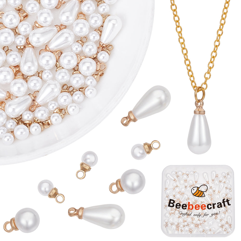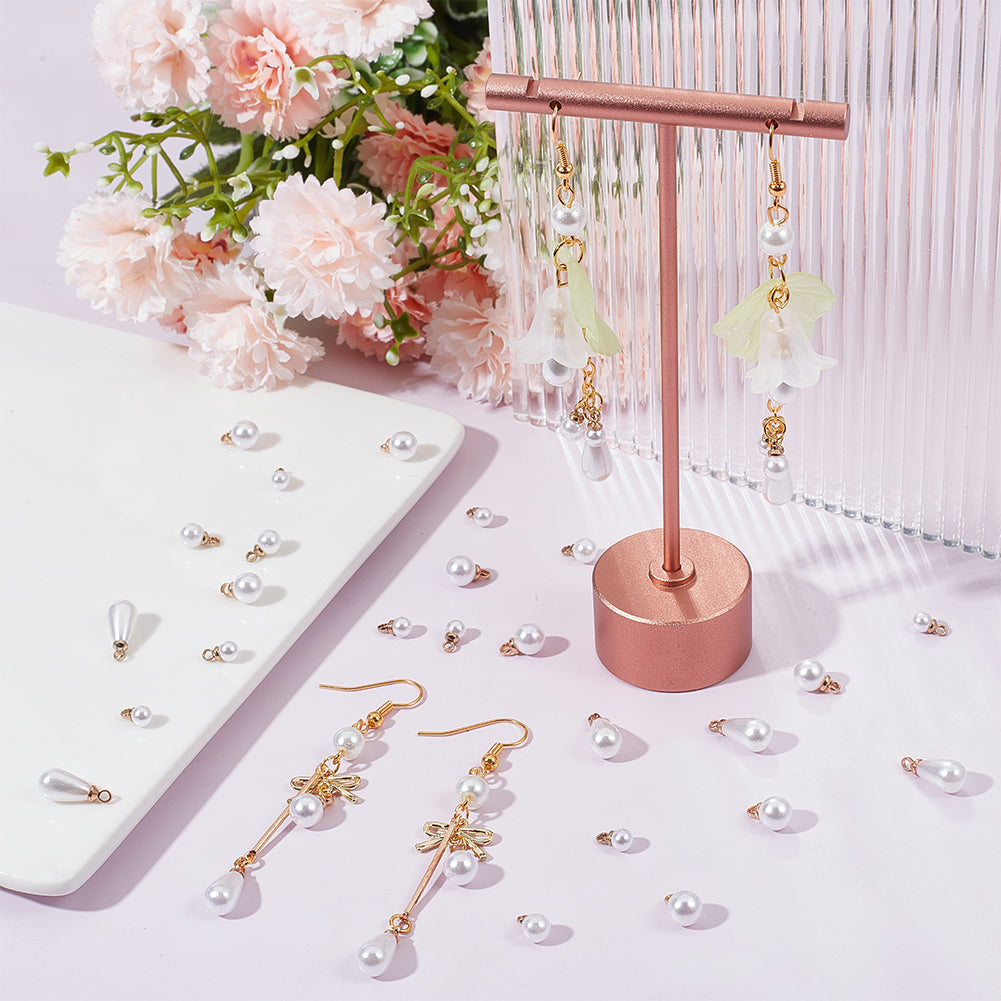 120Pcs 4 Style Plastic Imitation Pearl Charms, with Brass Finding, Cadmium Free & Lead Free, Teardrop/Round, Real 24K Gold Plated