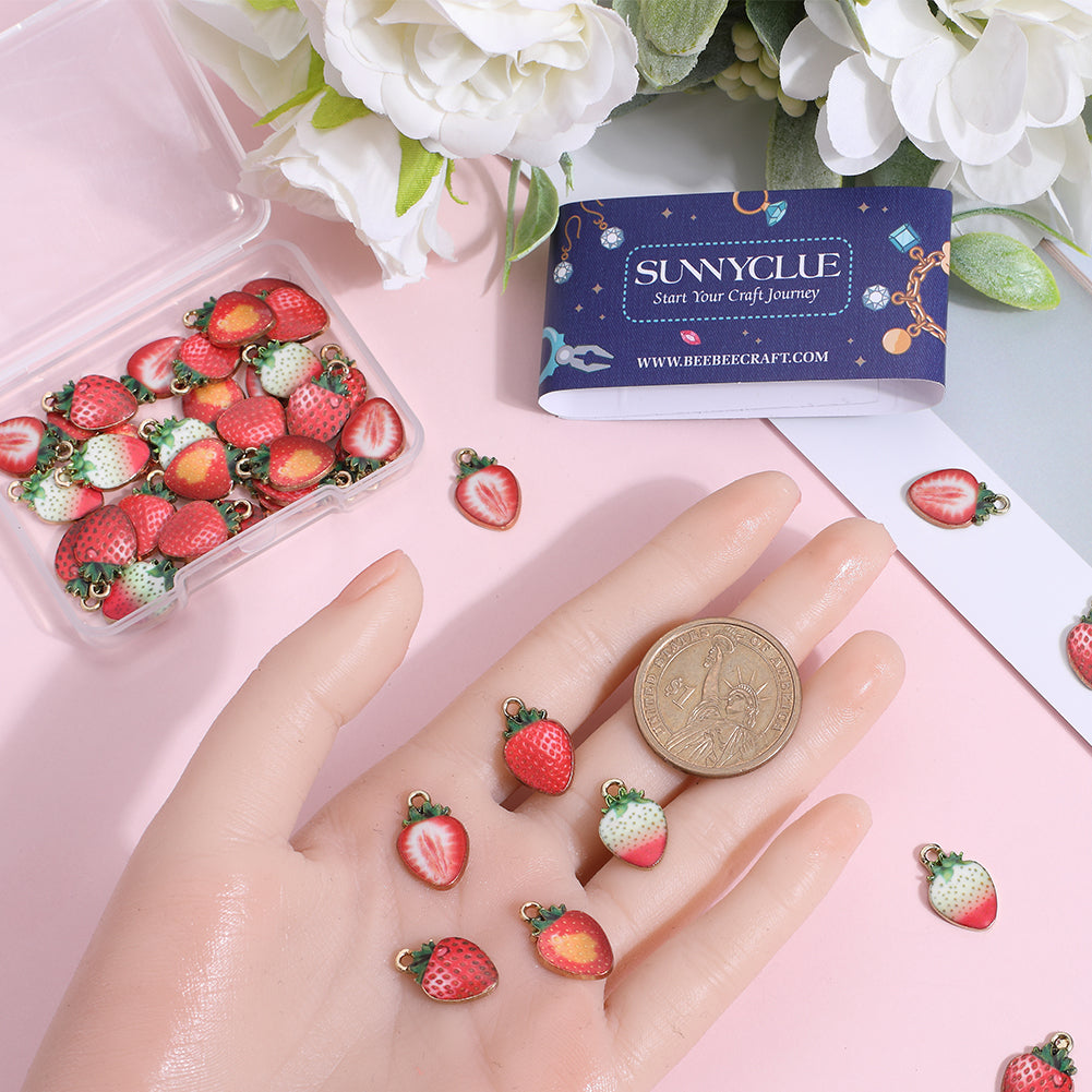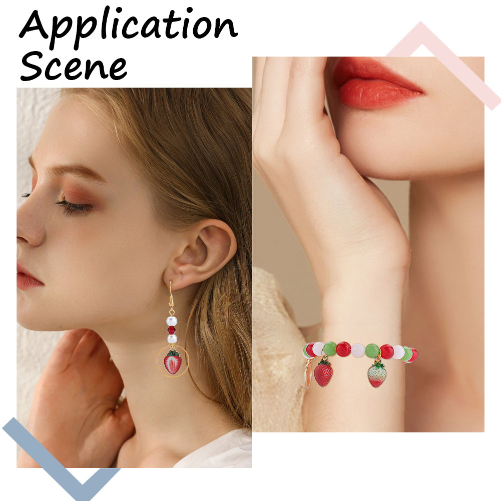 Strawberry Charm: about 0.67 inch(17mm) long, 0.41 inch(10.5mm) wide, 0.10 inch(2.5mm) thick, hole: 0.07 inch(1.8mm), 5 styles, 10pcs/style, 50pcs;