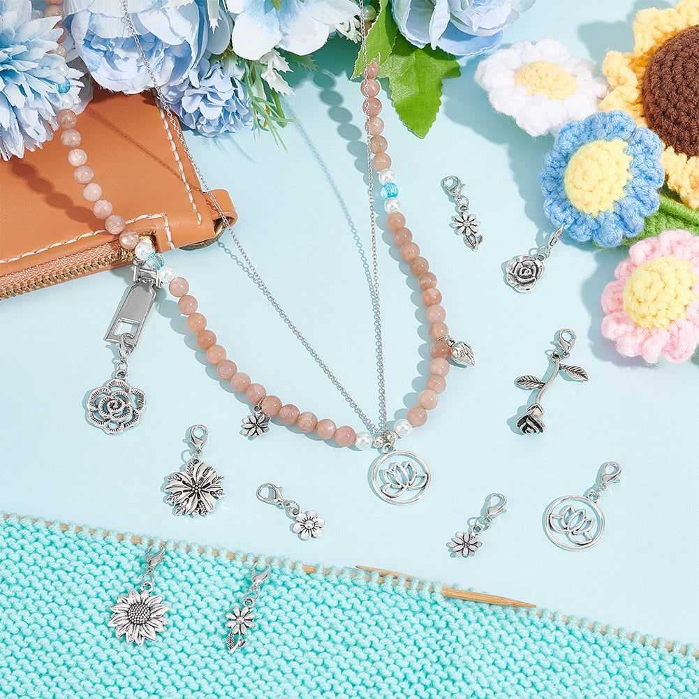 Flower Tibetan Style Alloy Pendant Decoration, with Lobster Claw Clasps, Antique Silver, 27~46mm, 10 style, 4pcs/style, 40pcs/set