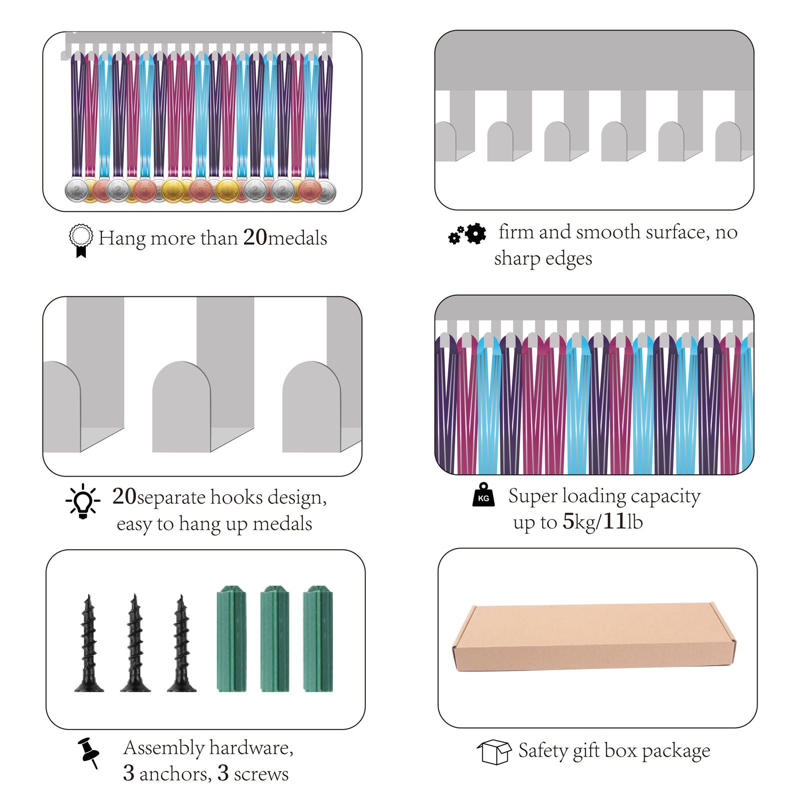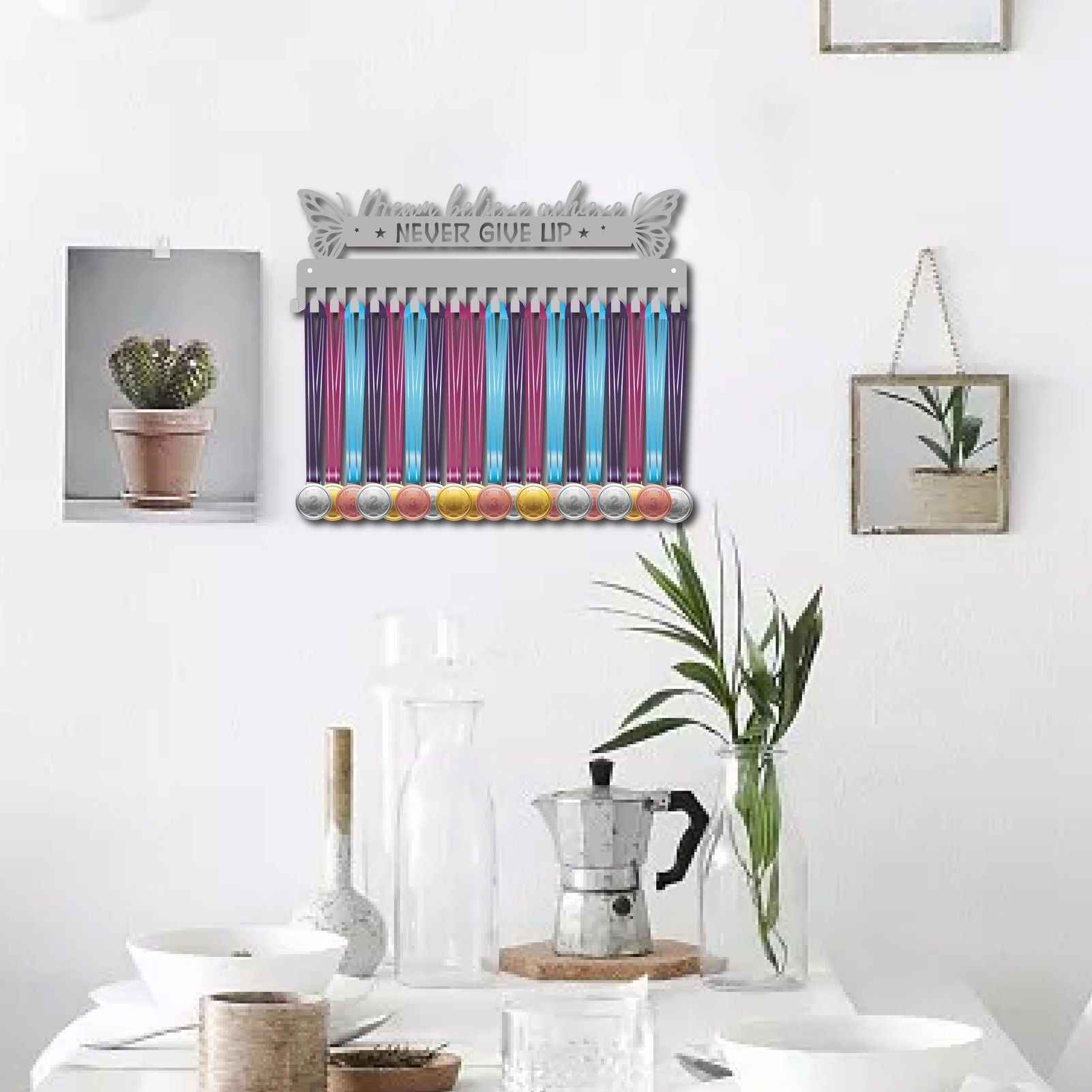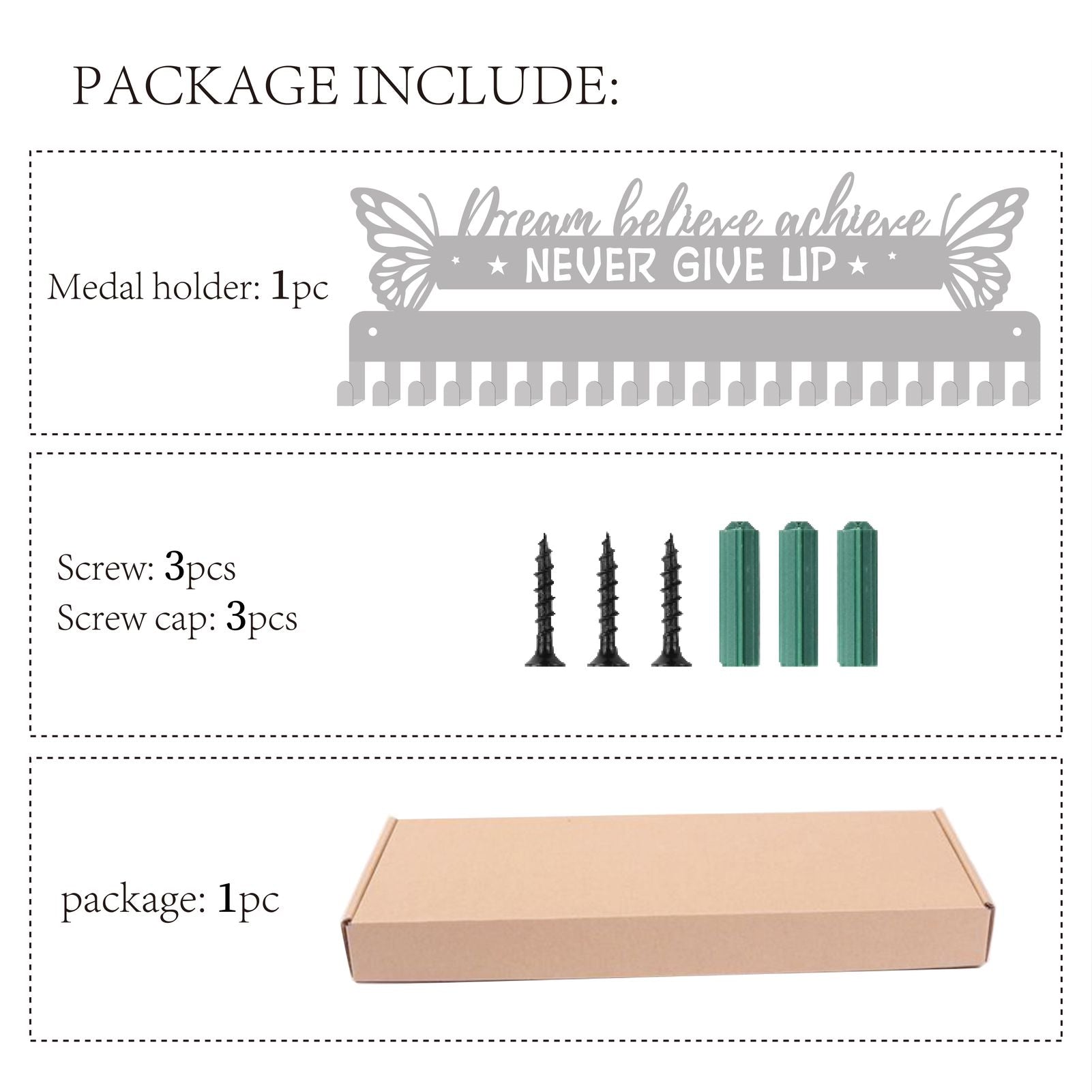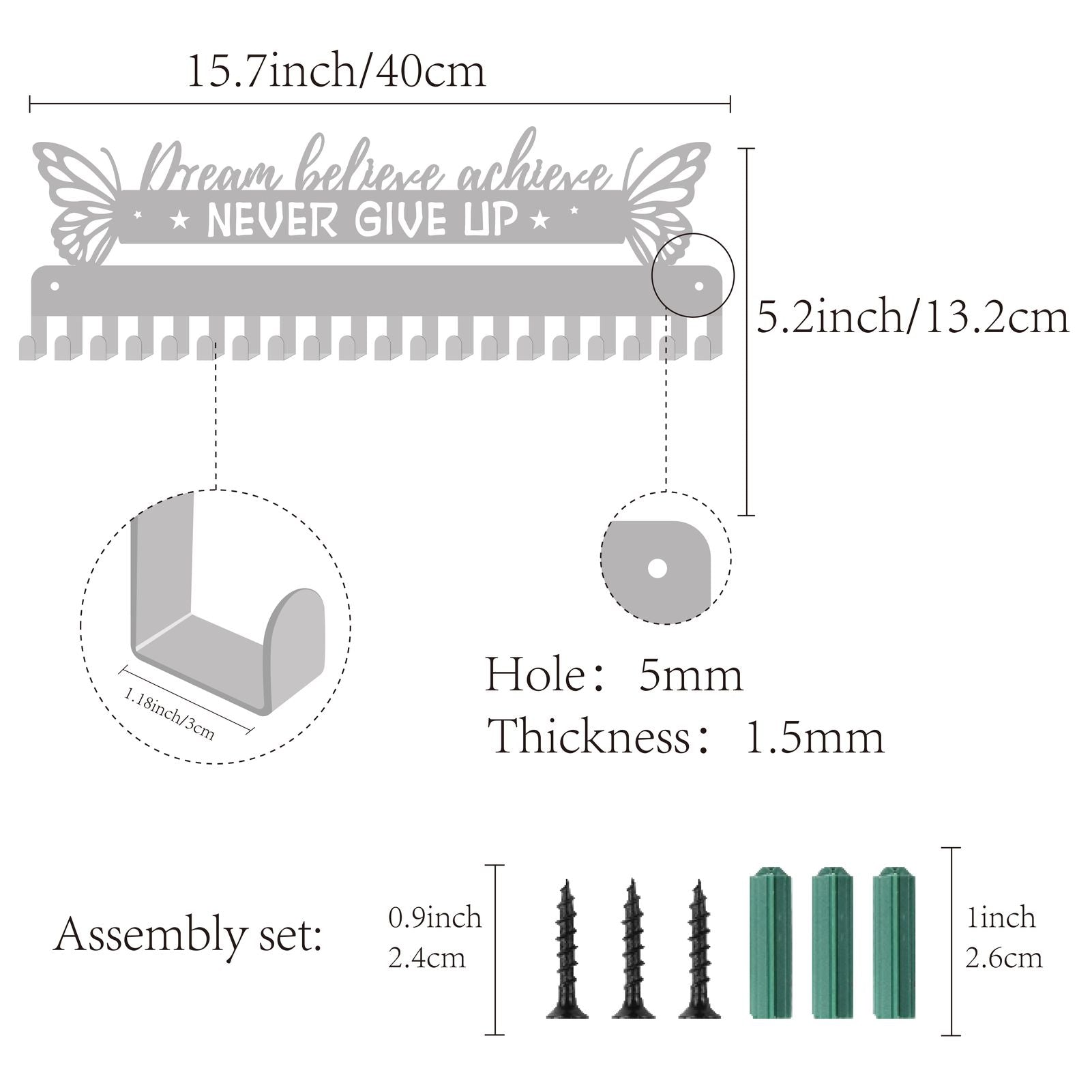 Fashion Iron Medal Hanger Holder Display Wall Rack, 20 Hooks, with Screws, Word Dream believe achieve NEVER GIVE UP, Silver Color Plated