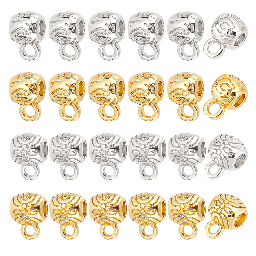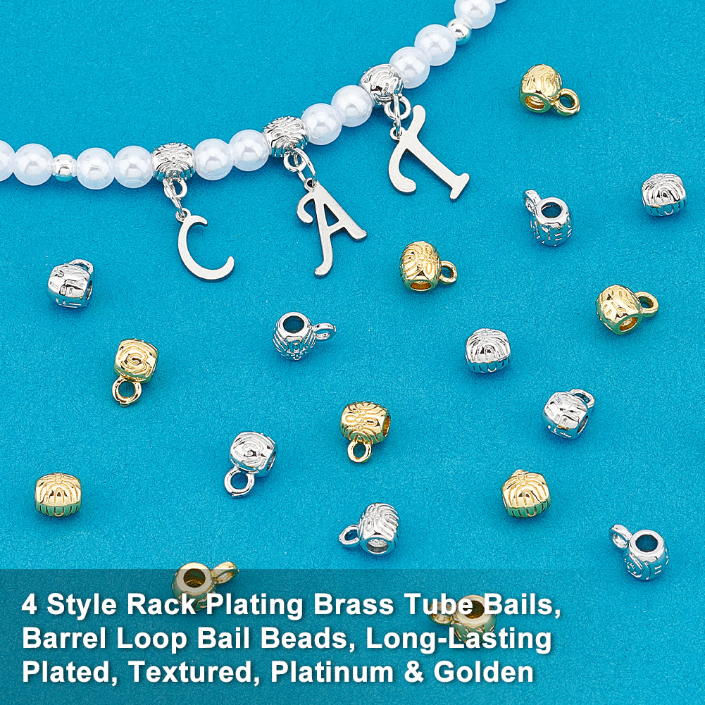 24Pcs 4 Style Rack Plating Brass Tube Bails, Barrel Loop Bail Beads, Long-Lasting Plated, Textured, Platinum & Golden