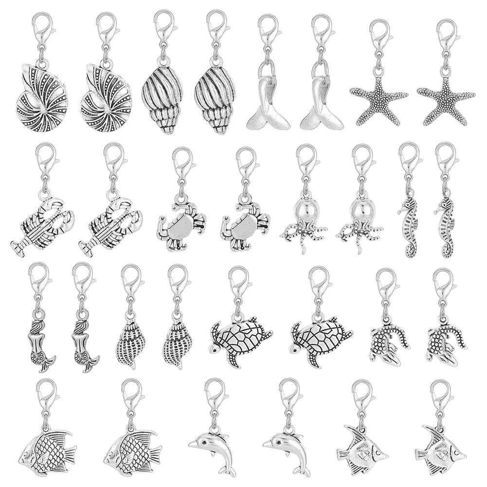 Sea Animal Theme Tibetan Style Alloy Pendant Decoration, with Lobster Claw Clasps, Antique Silver & Platinum, 30~38mm, 15 style, 2pcs/style, 30pcs/set