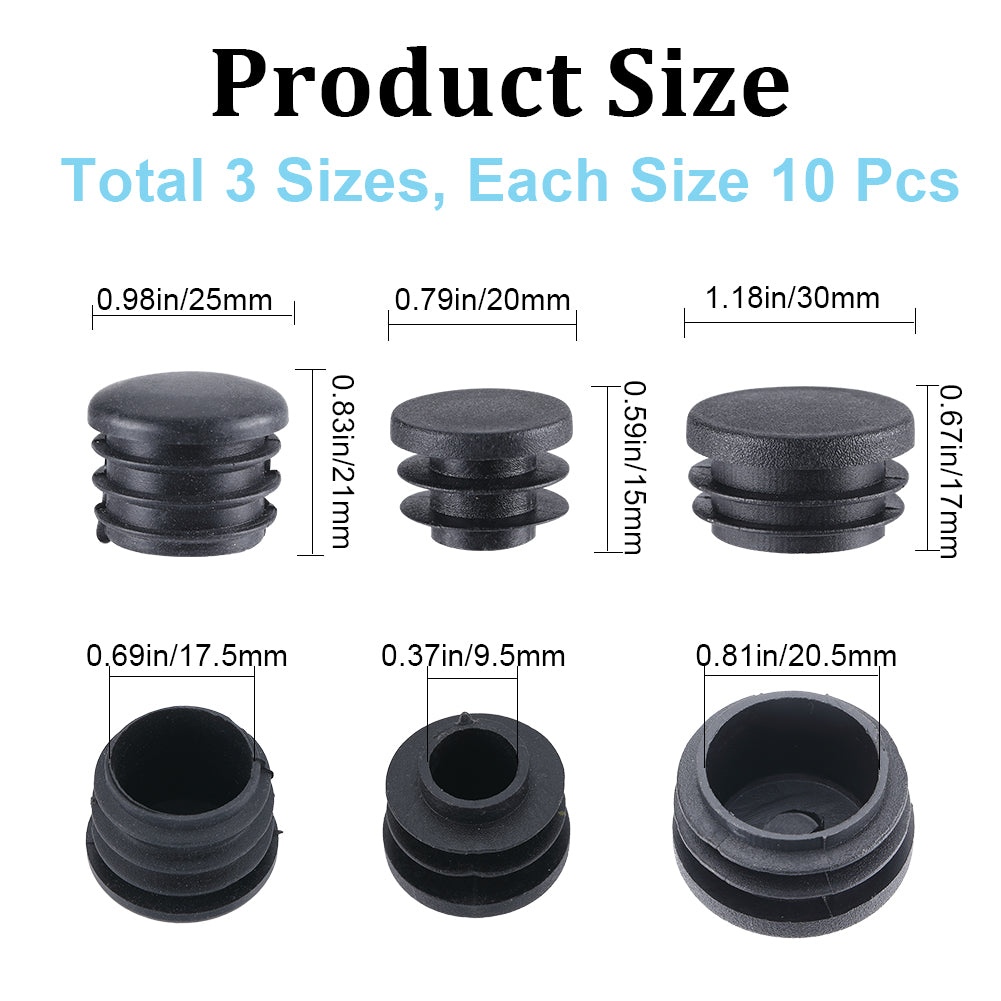 30Pcs 3 Styles Plastic Hole Plugs, Snap in Hole Plugs, Post Pipe Insert End Caps, for Furniture Fencing, Round, Black, 20~30x9.5~21mm, 10pcs/style