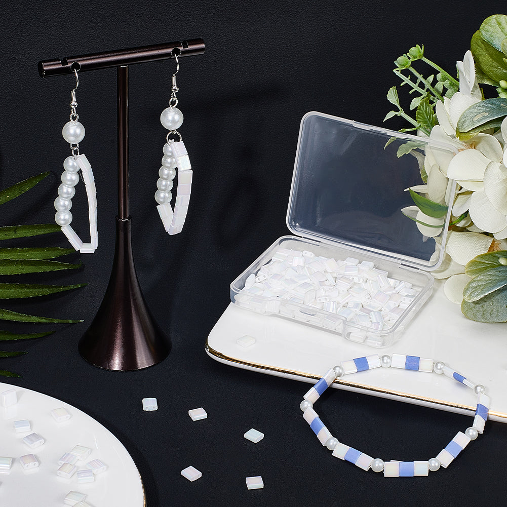 250Pcs 2-Hole Opaque Glass Seed Beads, AB Colours, Rectangle, White