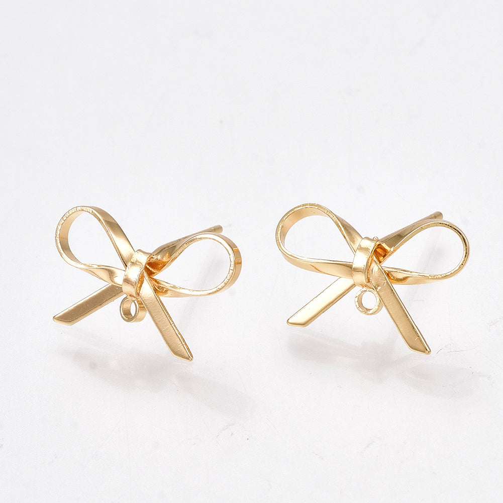 Brass Stud Earring Findings, with Loop, Bowknot, Nickel Free, Real 18K Gold Plated, 8~10x15mm, Hole: 1mm, Pin: 0.7mm, 50pc/Set
