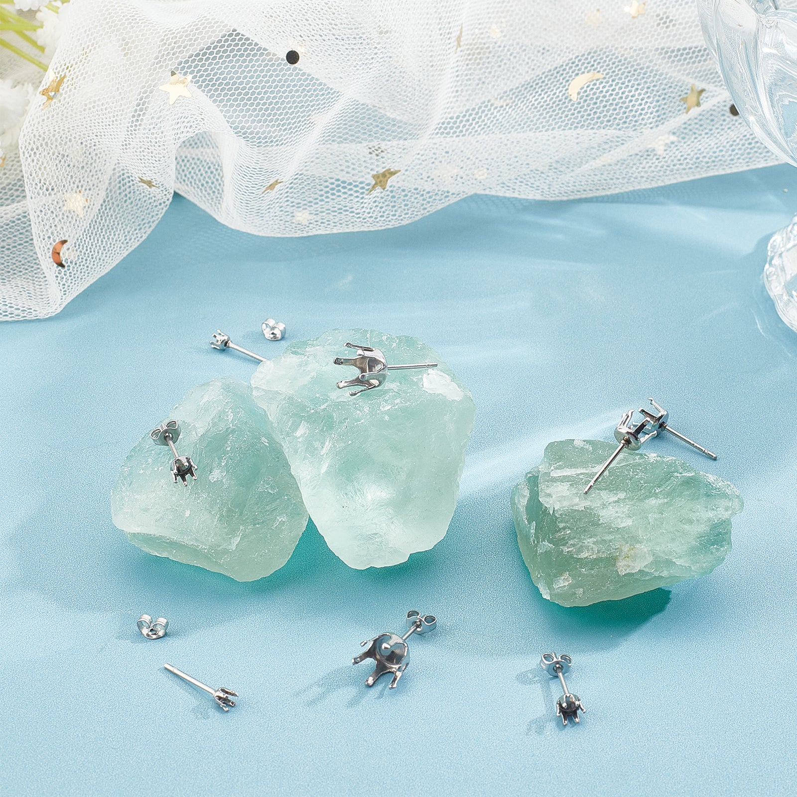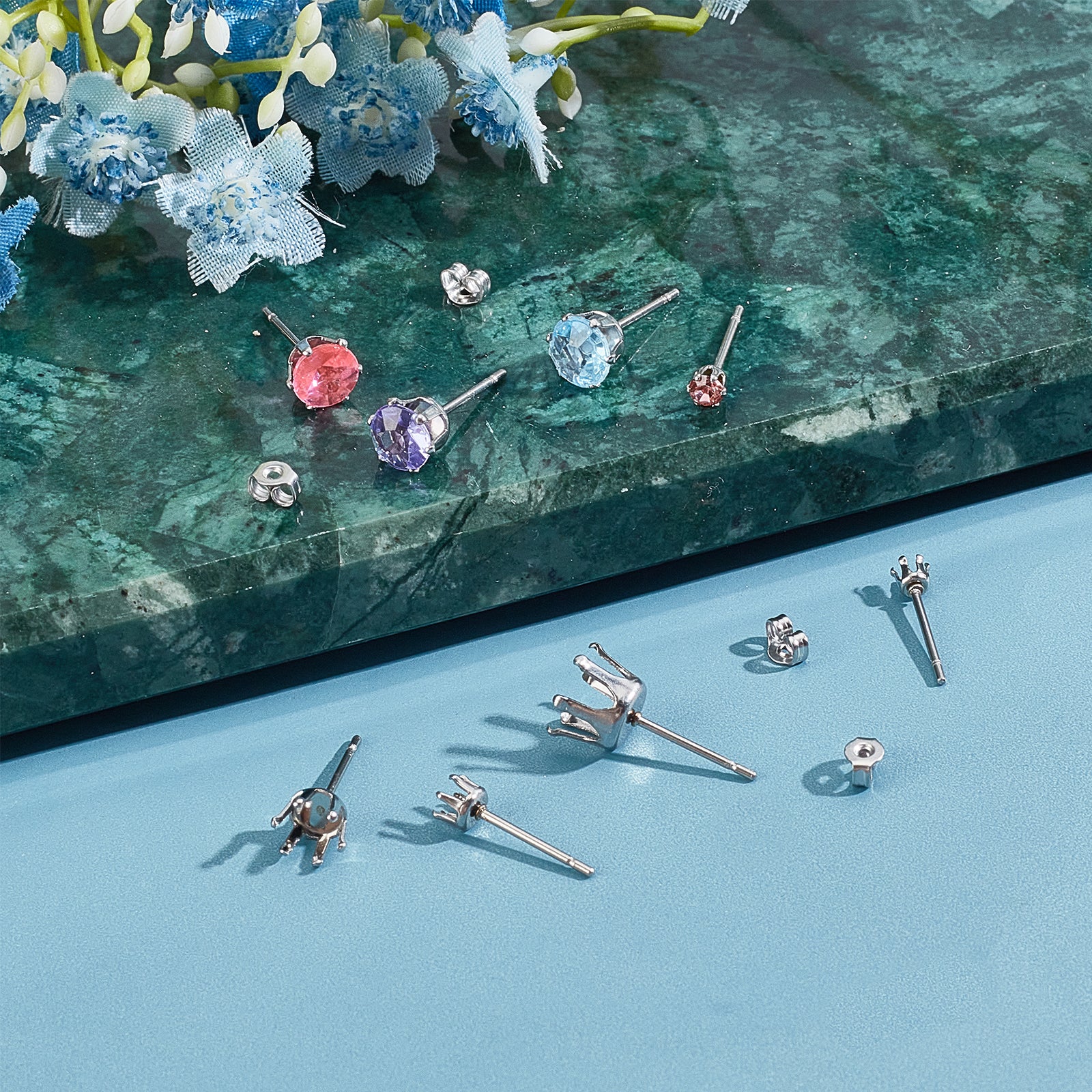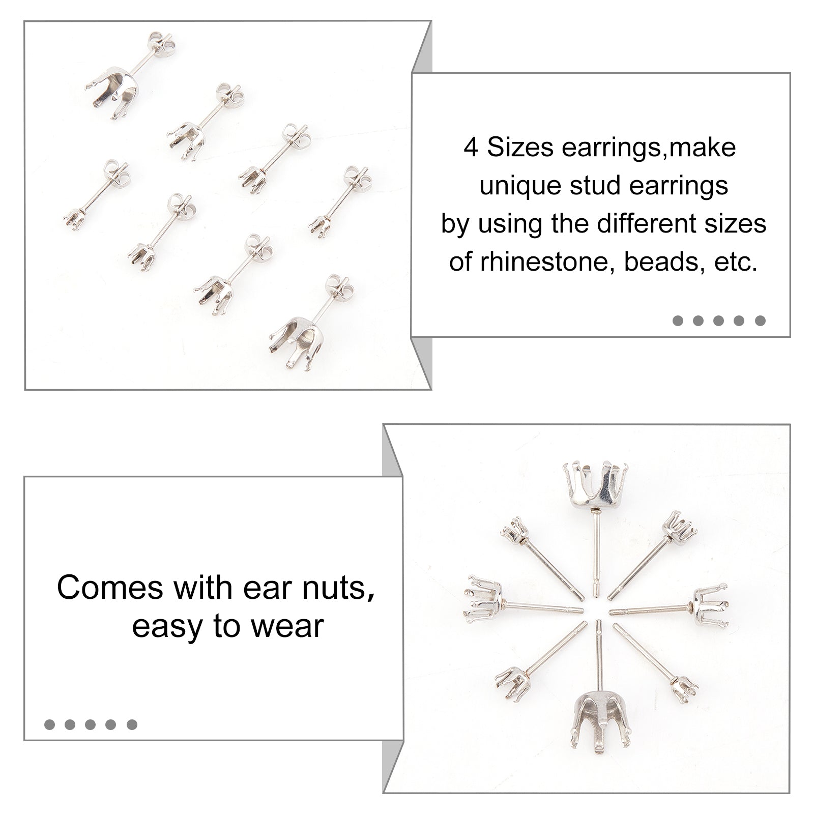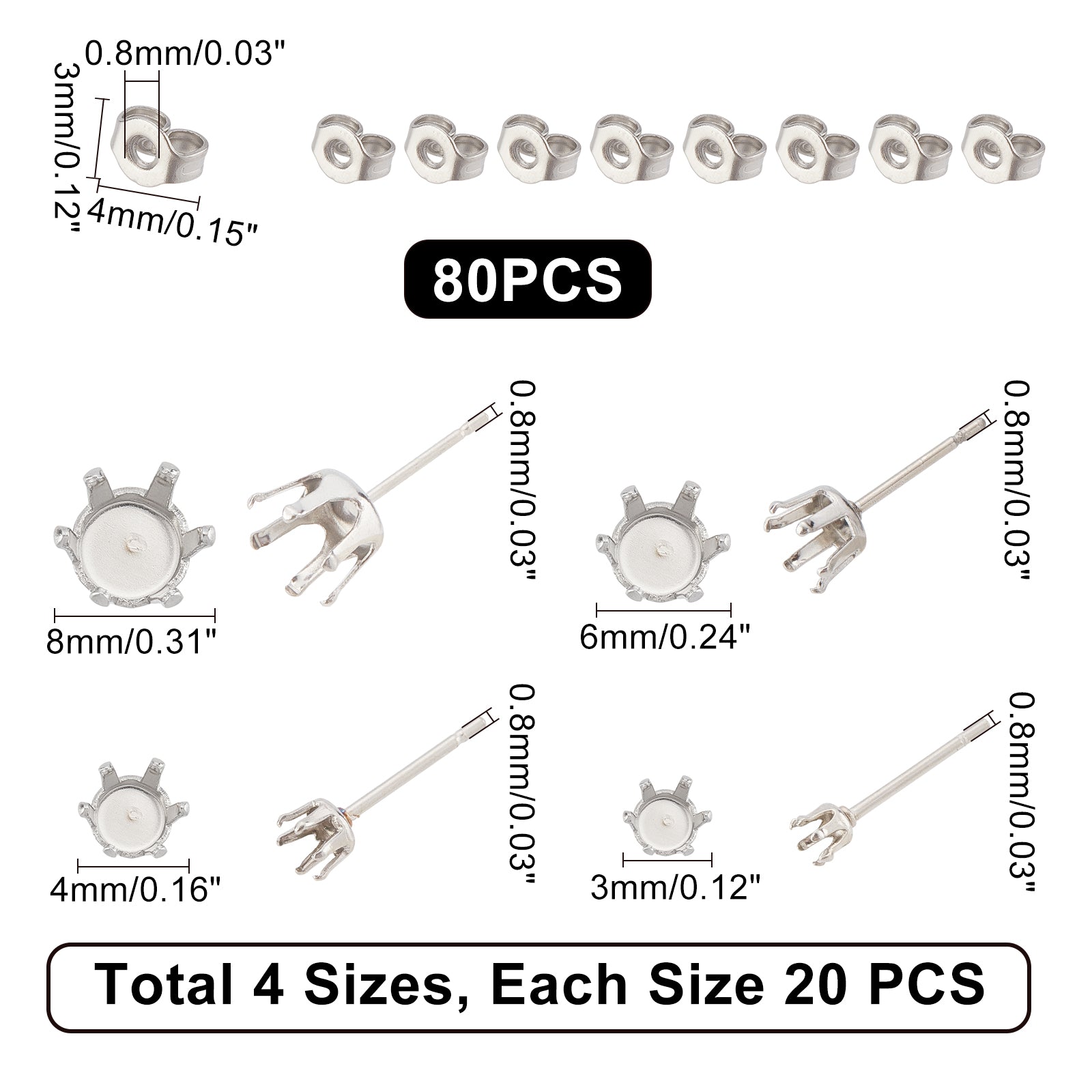 80Pcs 4 Colors 304 Stainless Steel Post Stud Earring Settings with 316 Surgical Stainless Steel Pins and 80Pcs 304 Stainless Steel Ear Nuts, Stainless Steel Color, 3~8mm, pin: 0.8mm, fit for 3~8mm rhinestone, 20pcs/color
