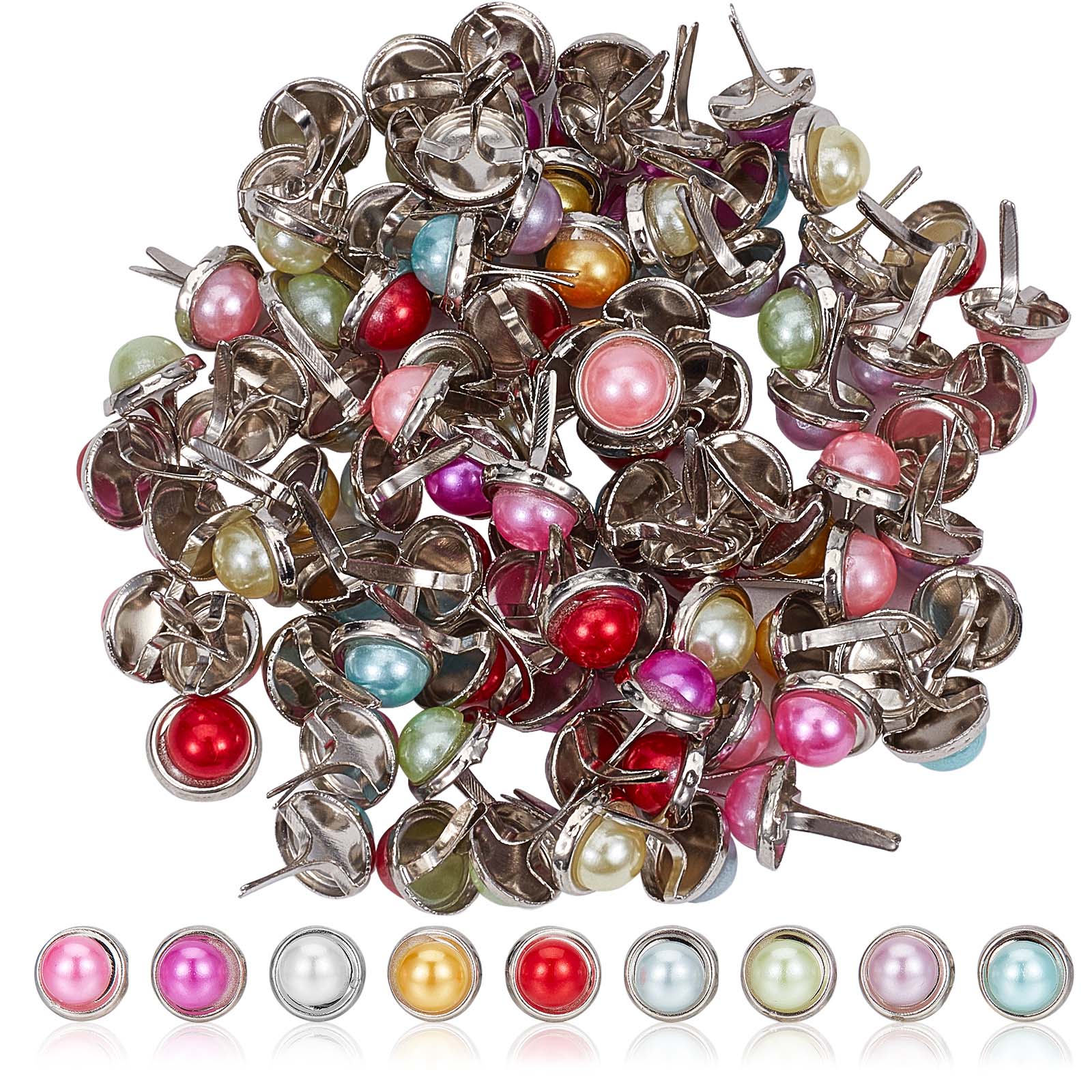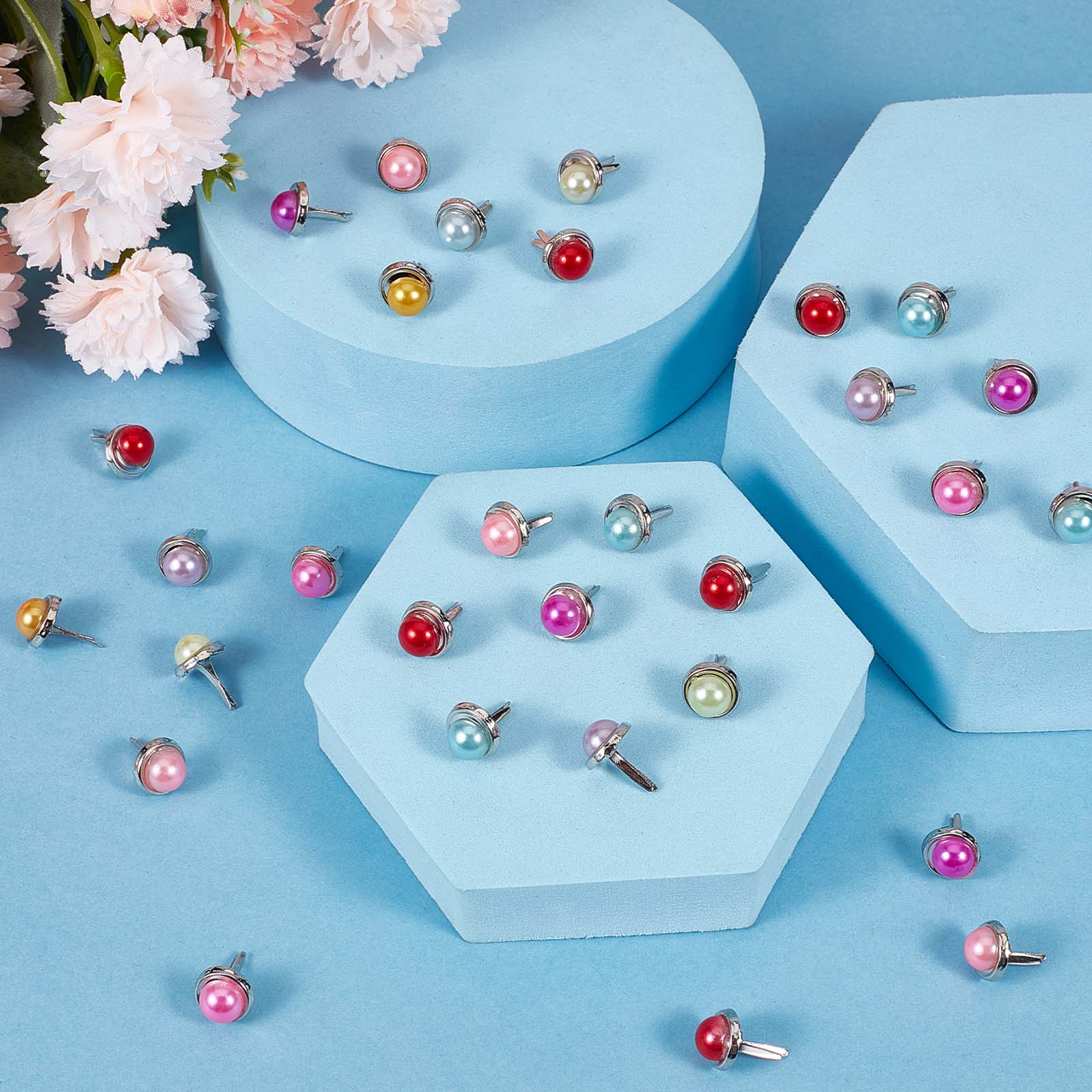 2 Bags Iron Fasteners Brads, with Plastic Imitation Pearl,for Scrapbooking, Photo Album, Embellishment Wedding Supplies, Children Puppy Dolls Decoration, Half Round, Mixed Color