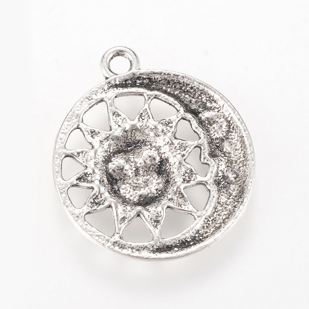 Tibetan Style Alloy Pendants, Flat Round with Sun & Moon, Cadmium Free & Lead Free, Antique Silver, 30x26.5x3mm, Hole: 2.5mm, 20pc/Set