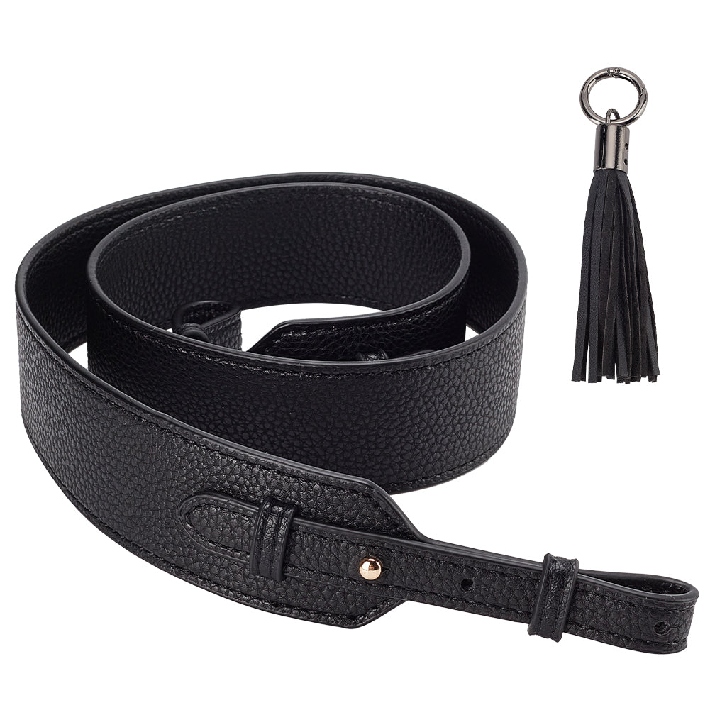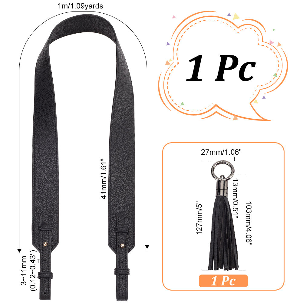 1Pc PU Leather Bag Handles, with Iron & Alloy Finding, 1Pc Tassel Big Pendant Decoration, with Alloy Spring Gate Rings, Black, Bag Handle: 100x4.1x0.3~1.1cm, Tassel: 12.7cm