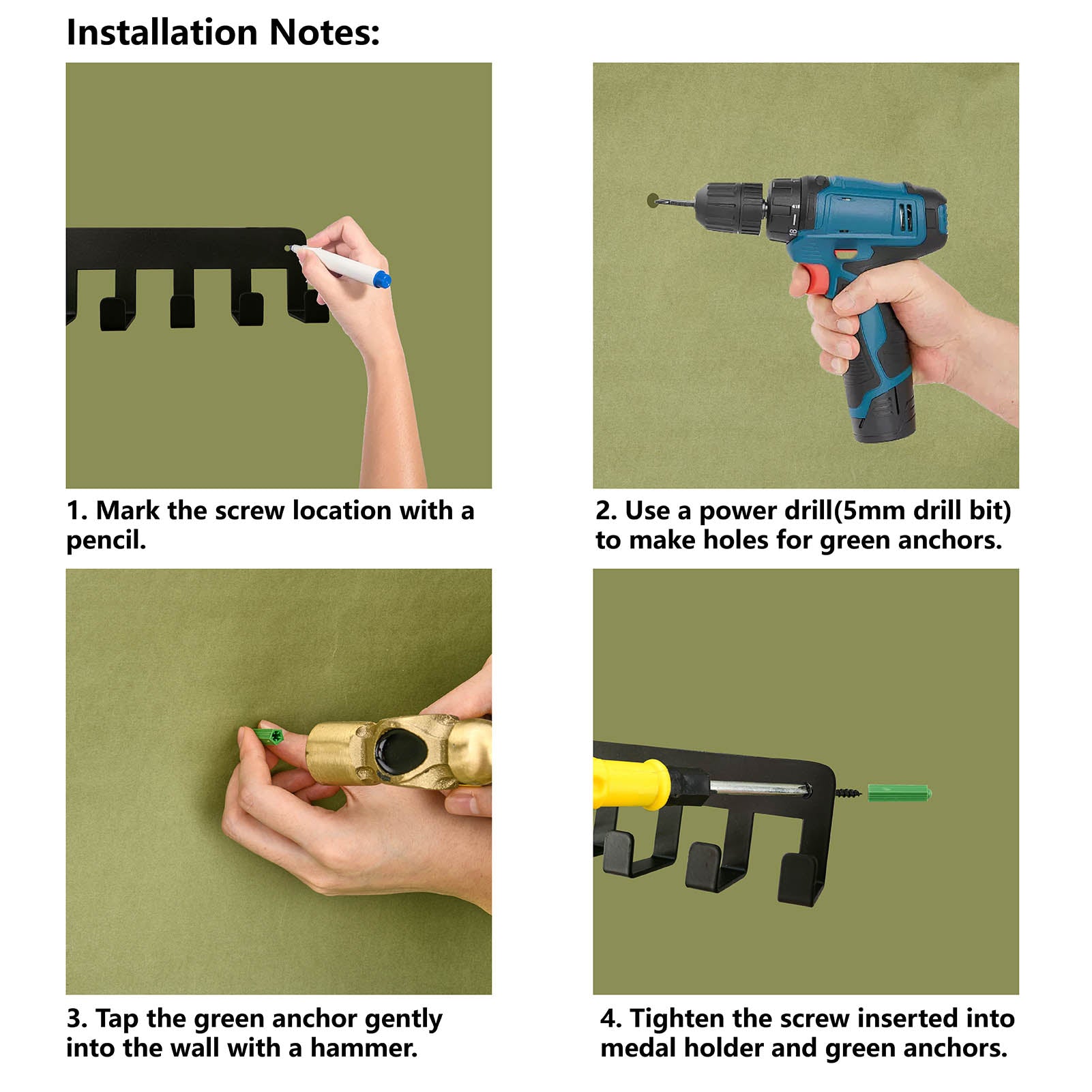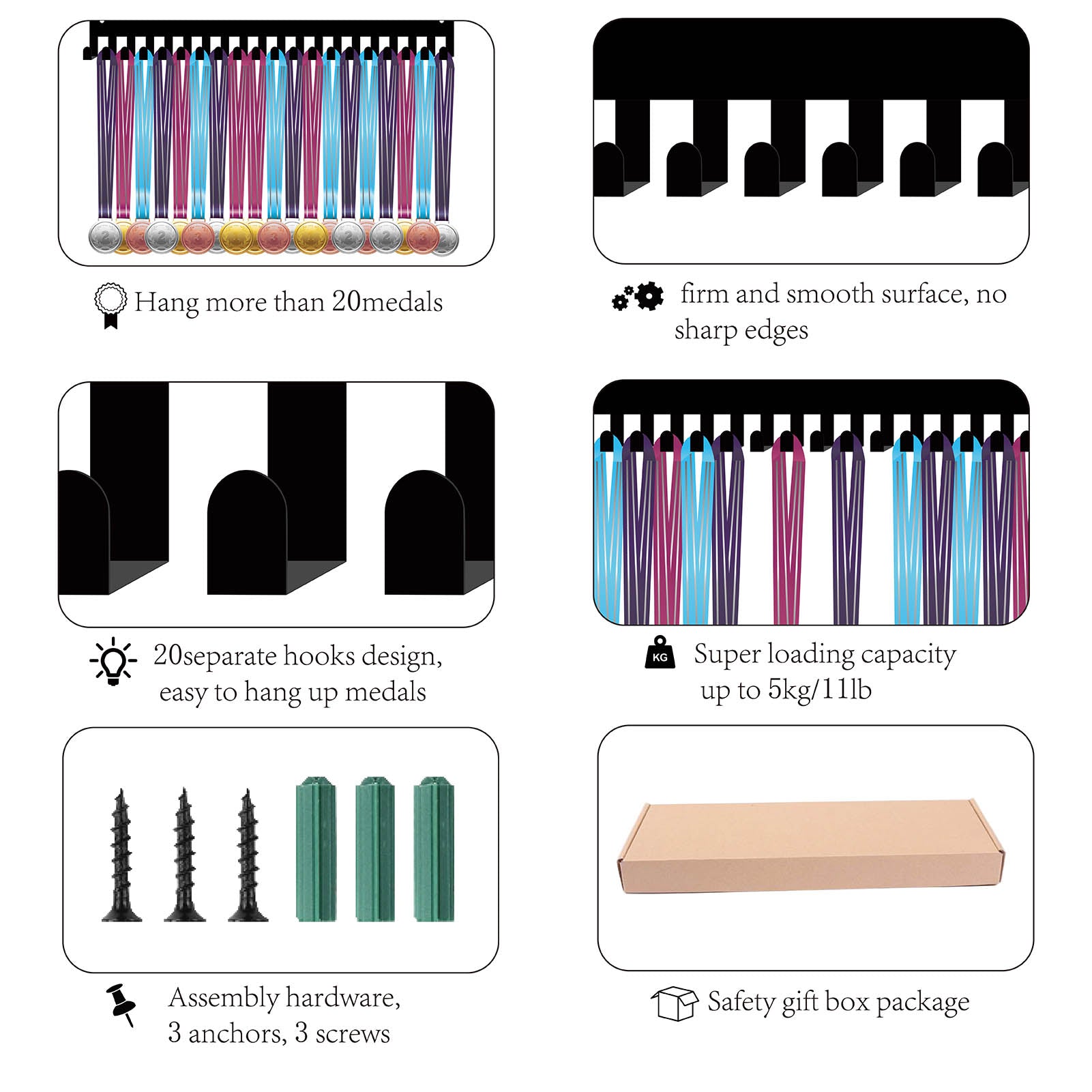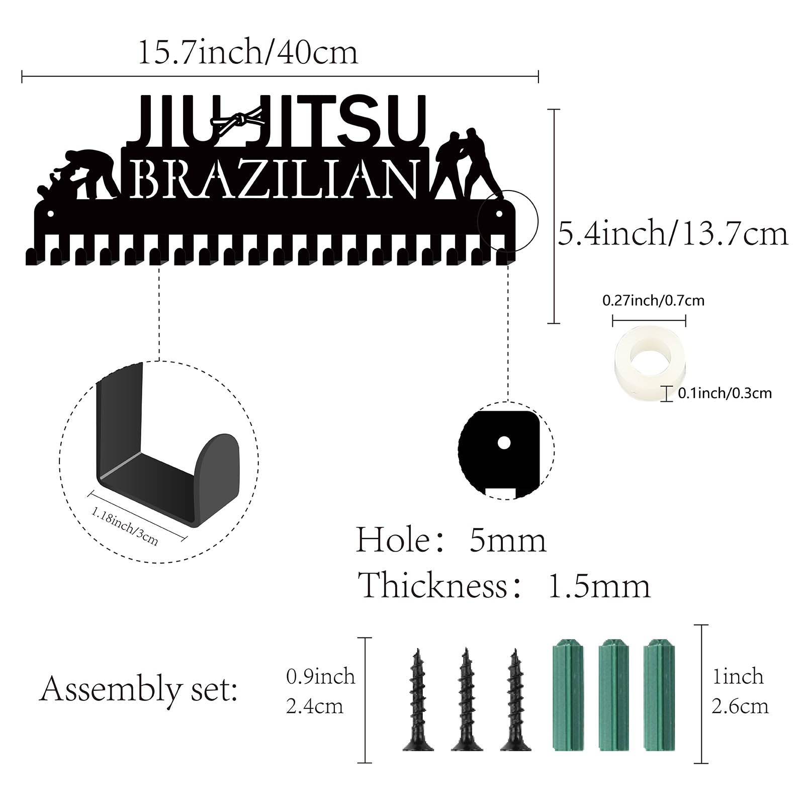 Iron Medal Holder Frame, Medals Display Hanger Rack, 20 Hooks, with Screws, Jiu-Jitsu Brazilian, Sports, 137x400mm, Hole: 5mm