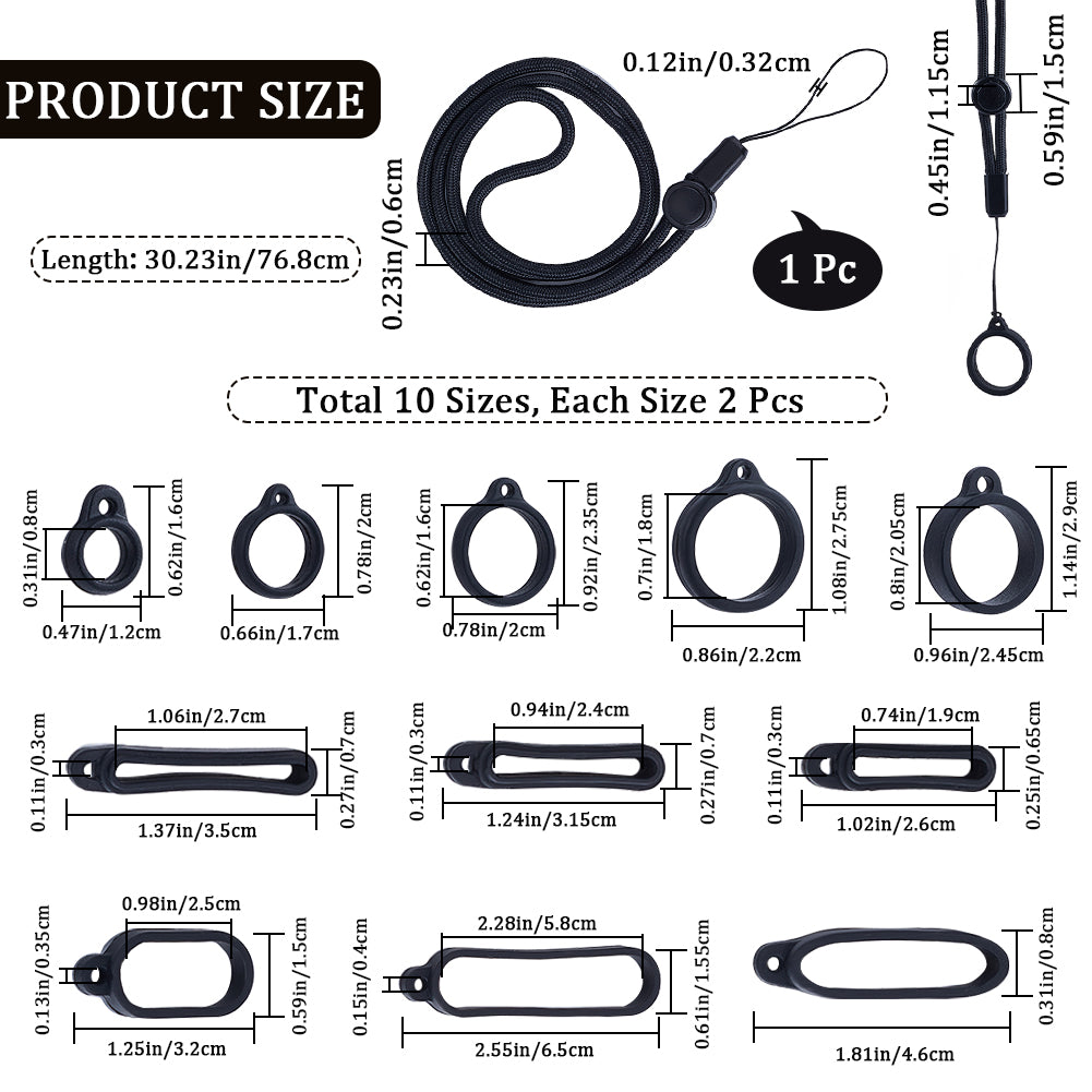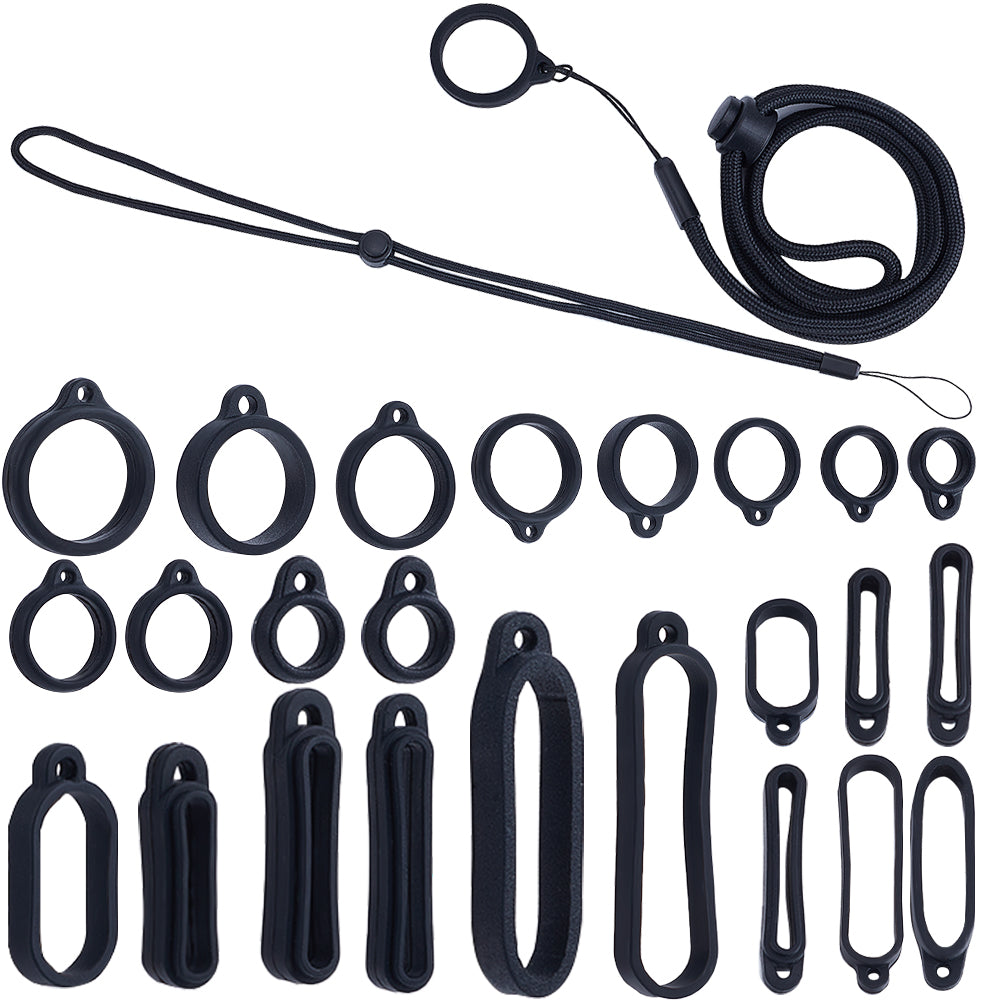 1Pc Adjustable Polyester Neck Lanyard, with 22Pcs 11 Style Silicone Ring Pendant, for Pen, Phone, Badge Holder, Black