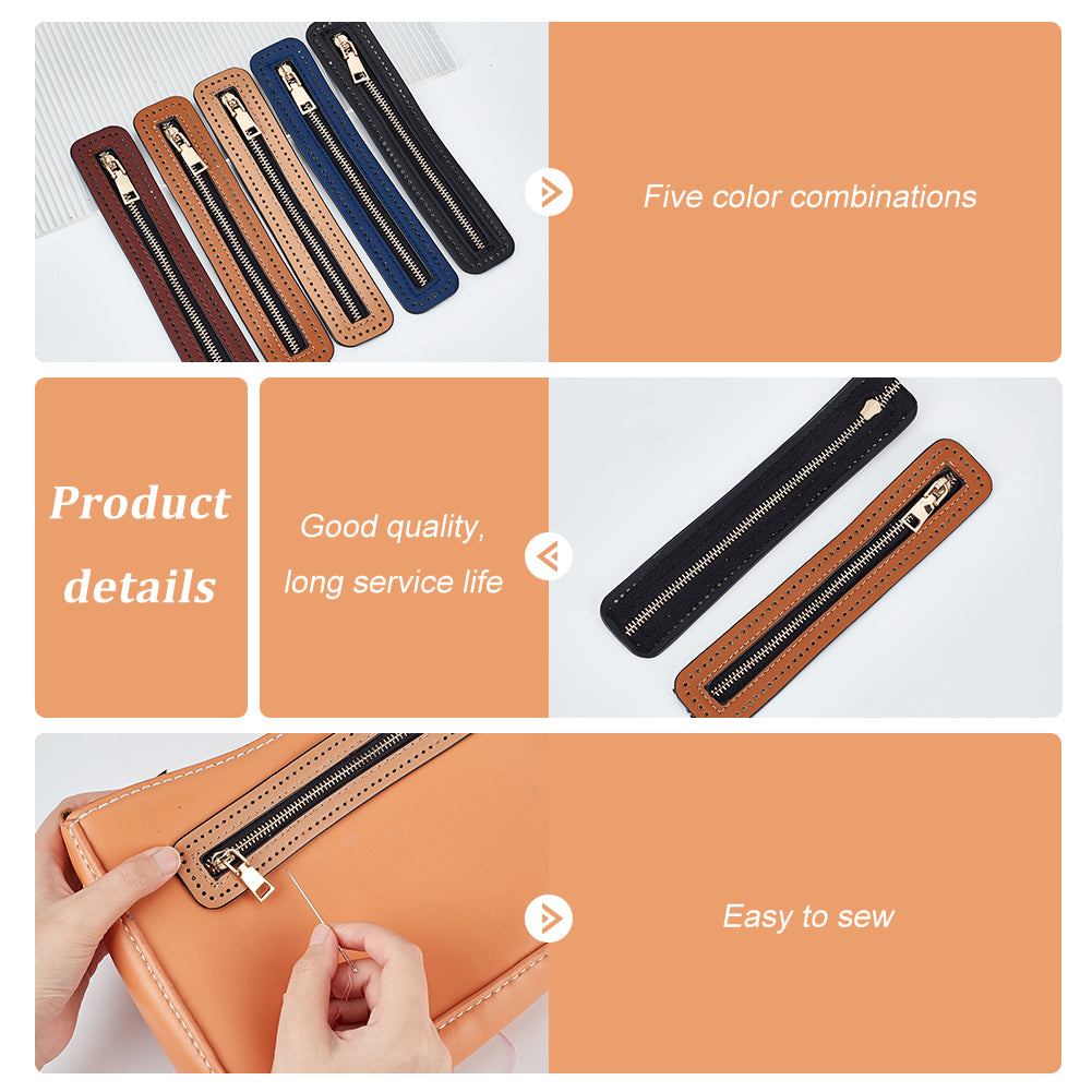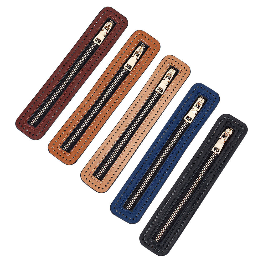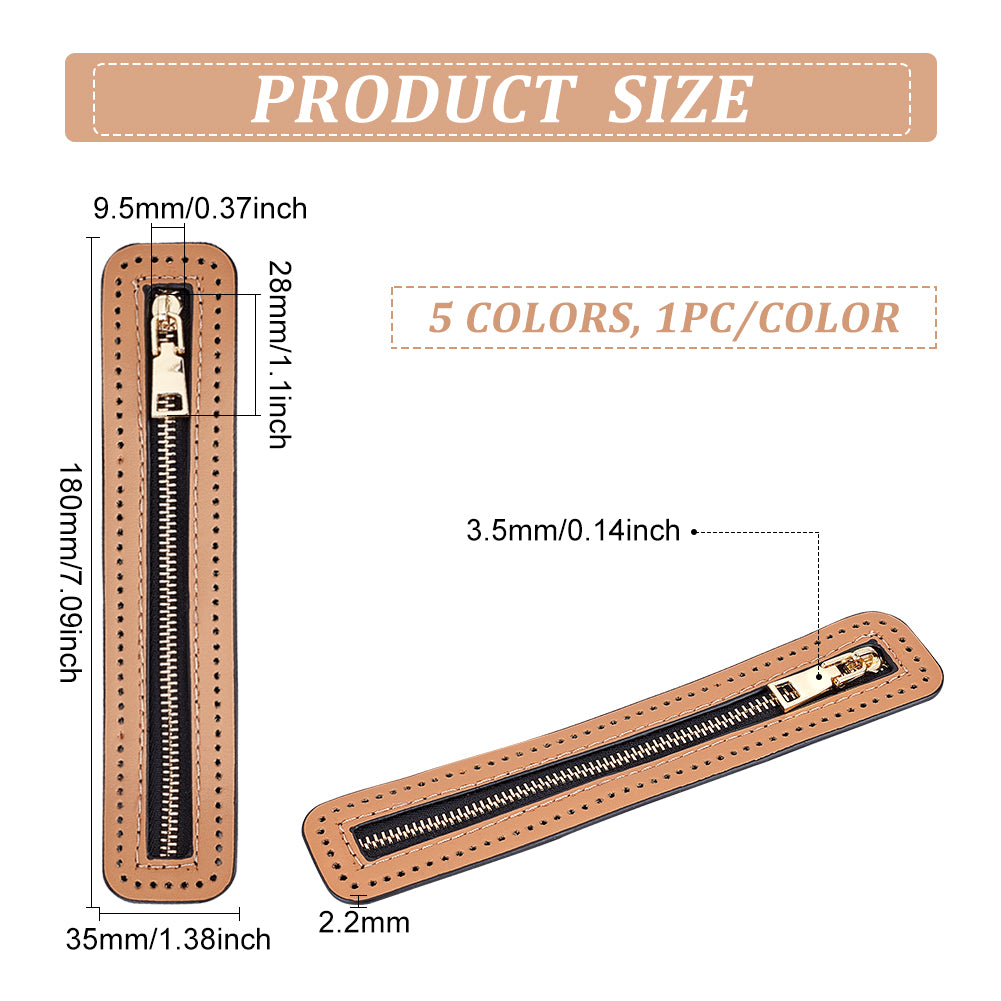 5Pcs 5 Colors PU Leather Zipper Sewing Accessories, with Brass Zipper Puller, for DIY Woven Bag, Mixed Color, 18x3.5x0.22cm, 1pc/color