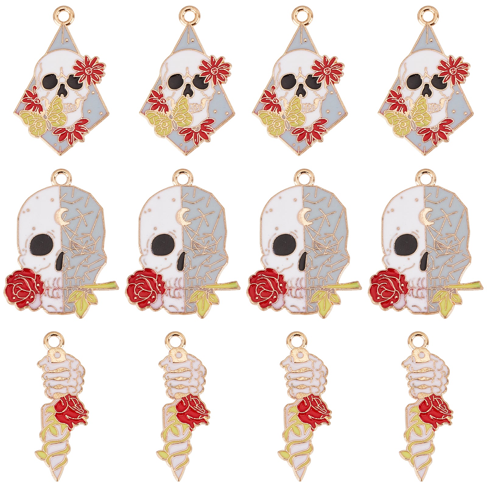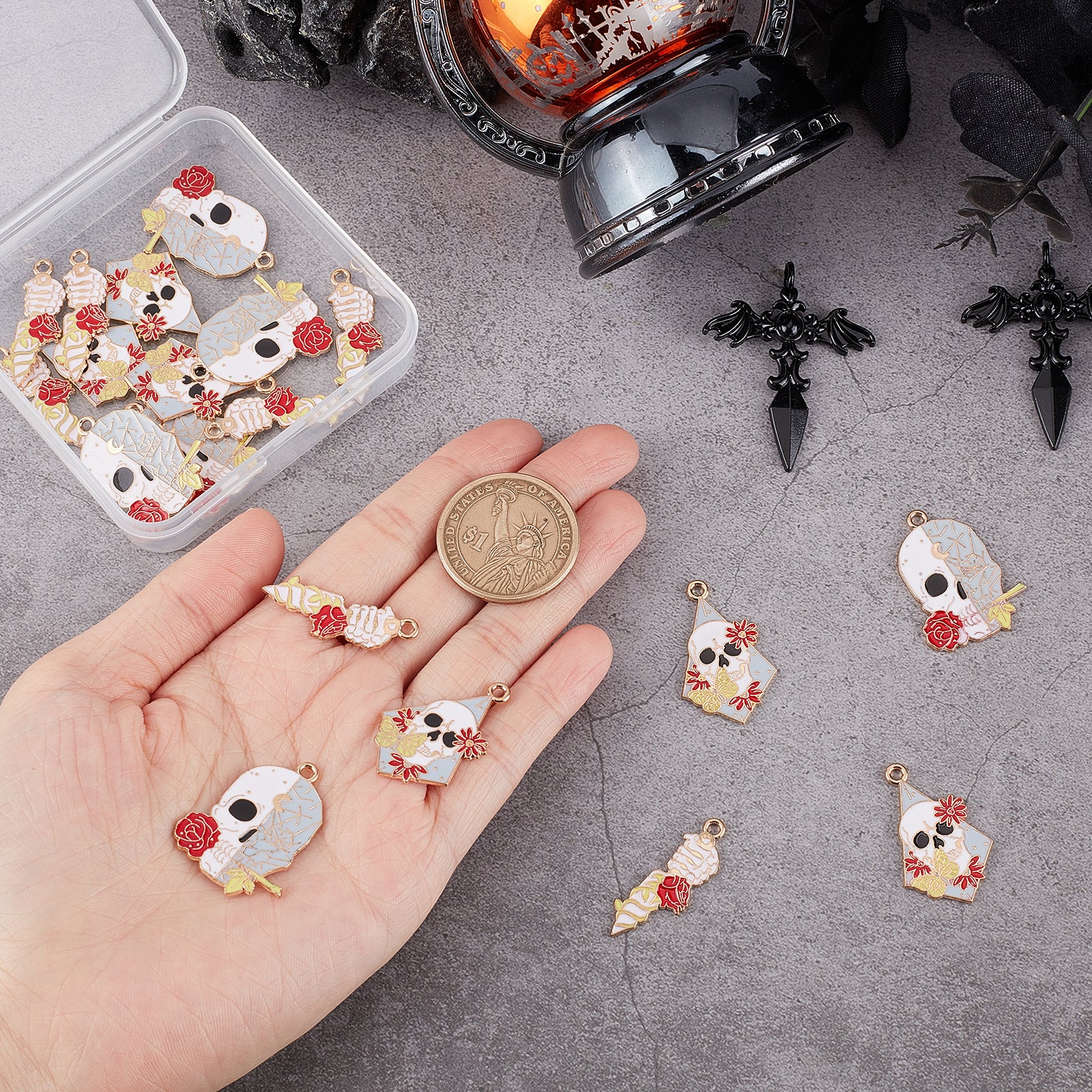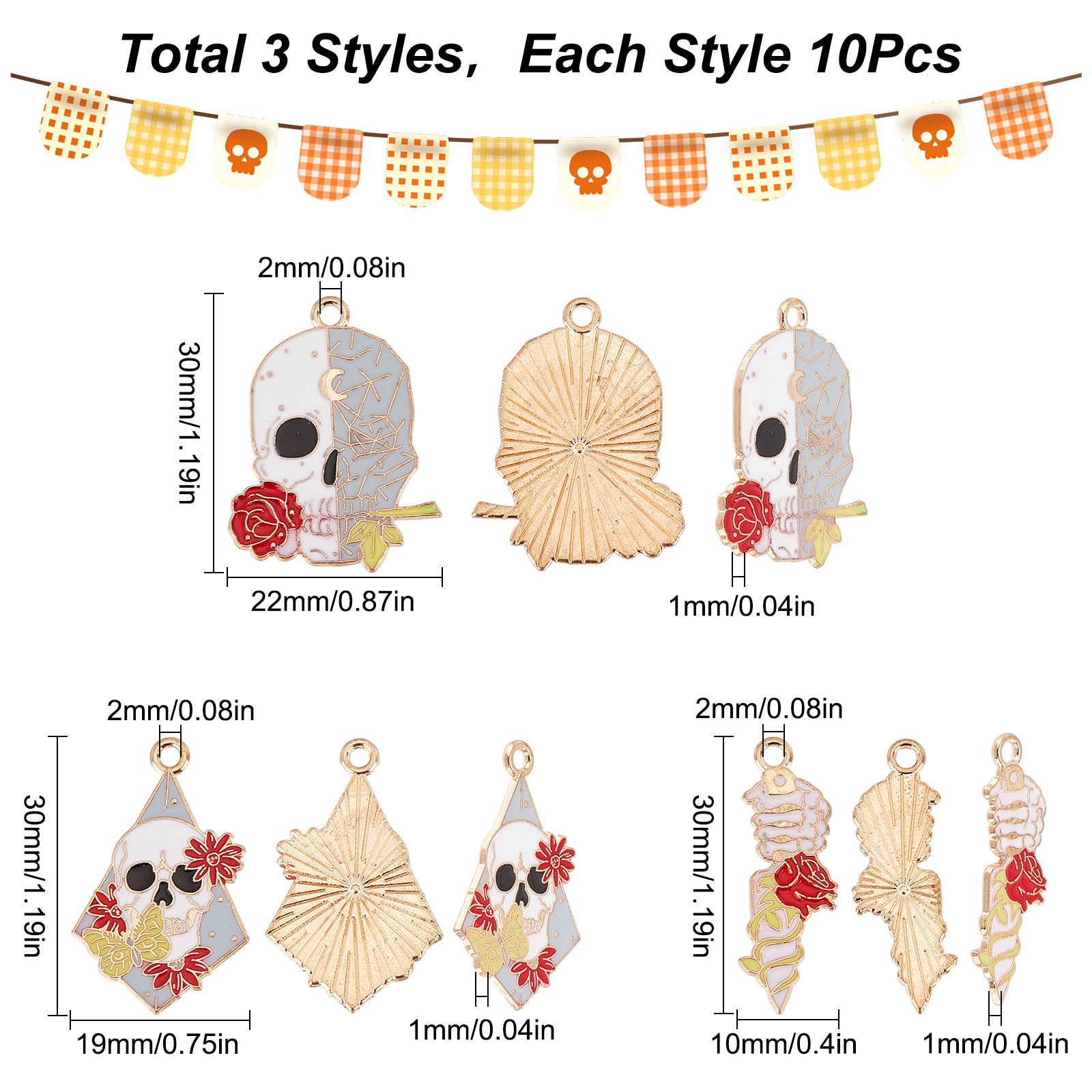 30Pcs 3 Style Halloween Alloy Enamel Pendants, Light Gold, Skull with Rose & Rhombus with Skull & Flower & Butterfly & Awl with Rose, Mixed Color