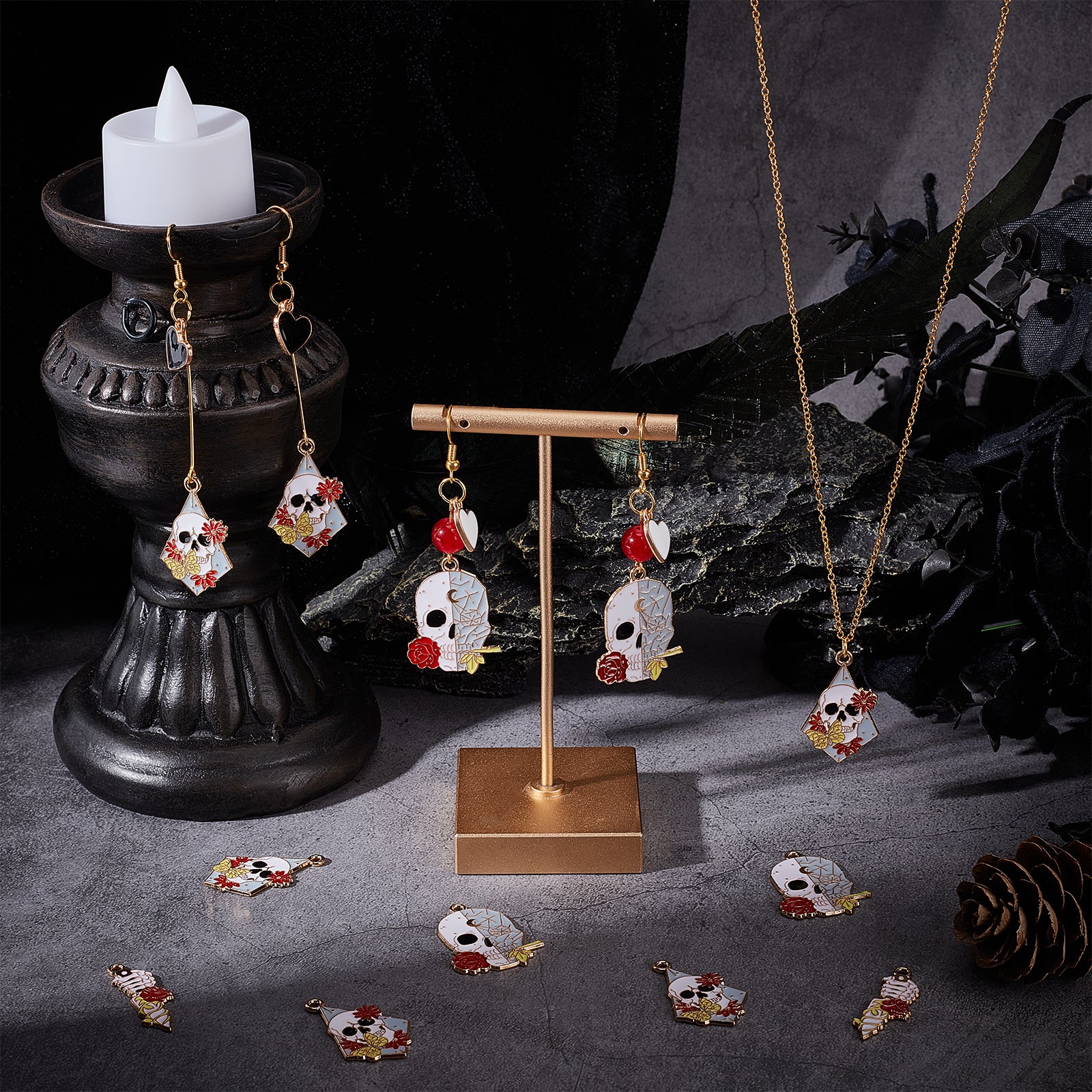 30Pcs 3 Style Halloween Alloy Enamel Pendants, Light Gold, Skull with Rose & Rhombus with Skull & Flower & Butterfly & Awl with Rose, Mixed Color, 30x10~22x1mm, Hole: 2mm, 10pcs/style