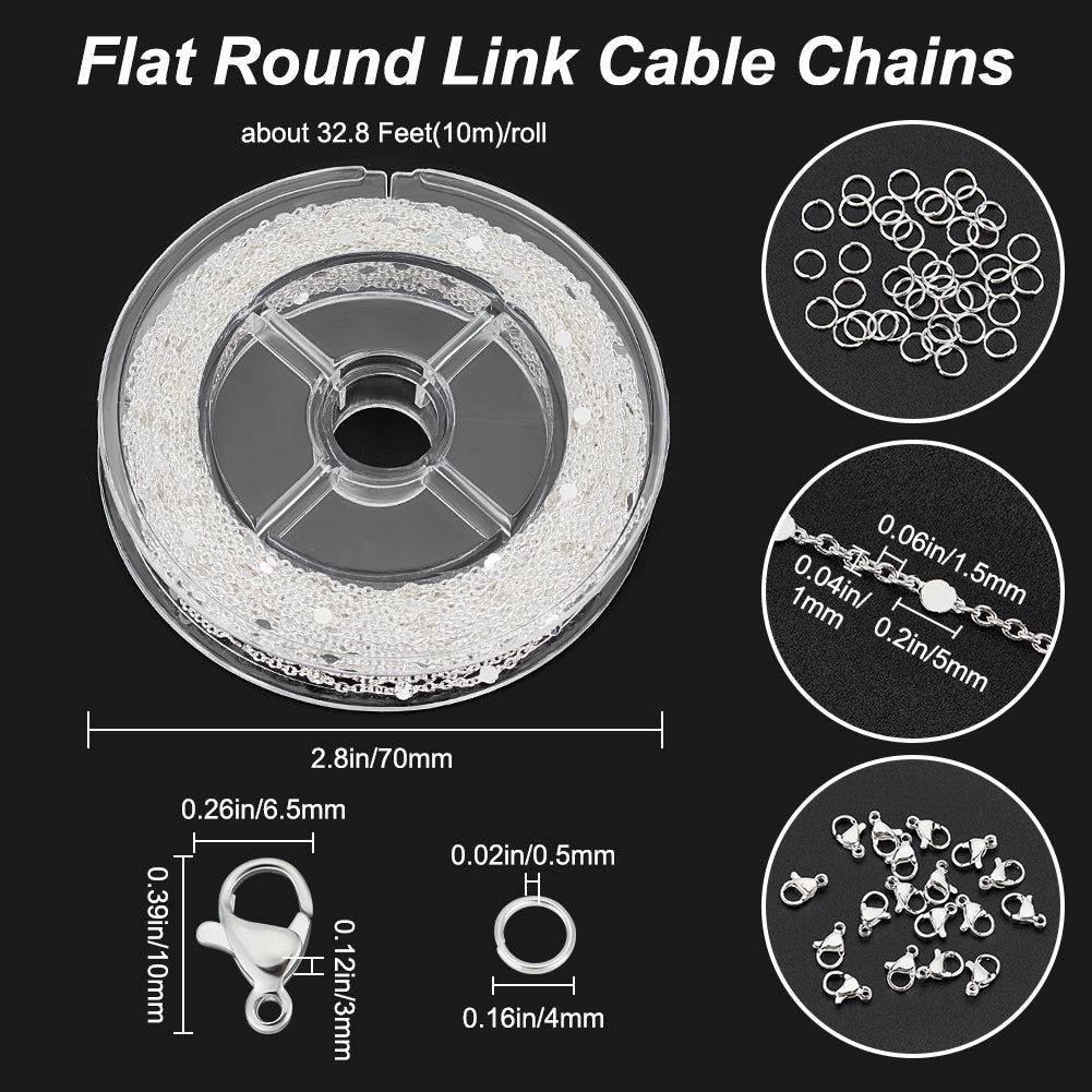 DIY Chain Bracelet Necklace Making Kit, Including Brass Flat Round Link Chains, 304 Stainless Steel Clasps & Jump Rings, Silver, Chain: 10M/set