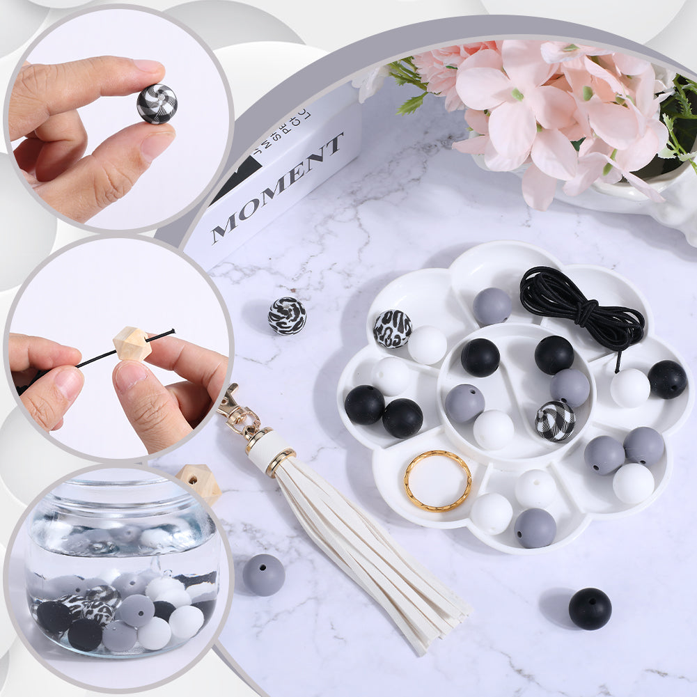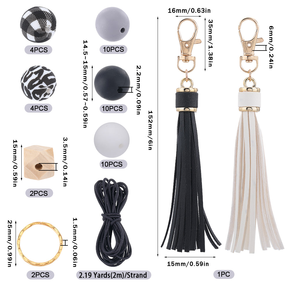 DIY Keychain Making Kit, Including Polygon & Round Silicone & Unfinished Wood Beads, PU Leather Tassel Pendants, Iron Split Key Rings, Black