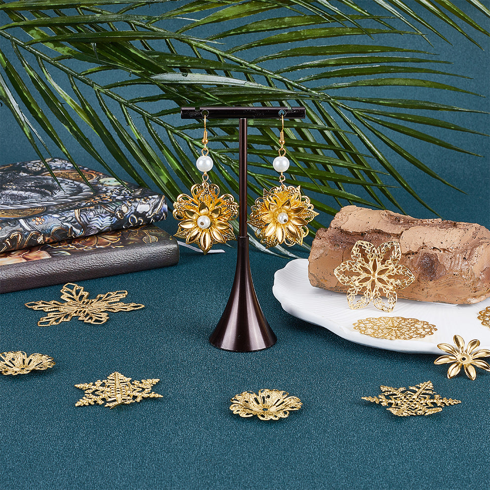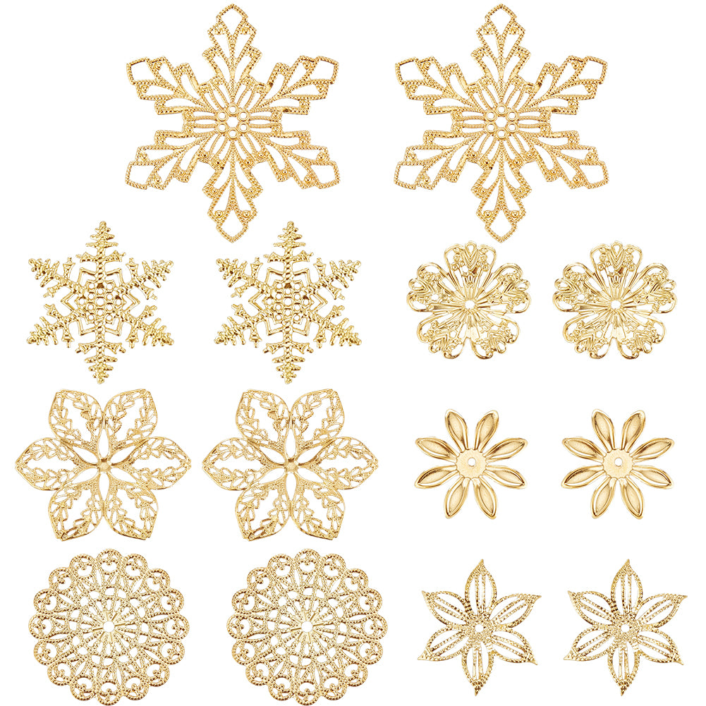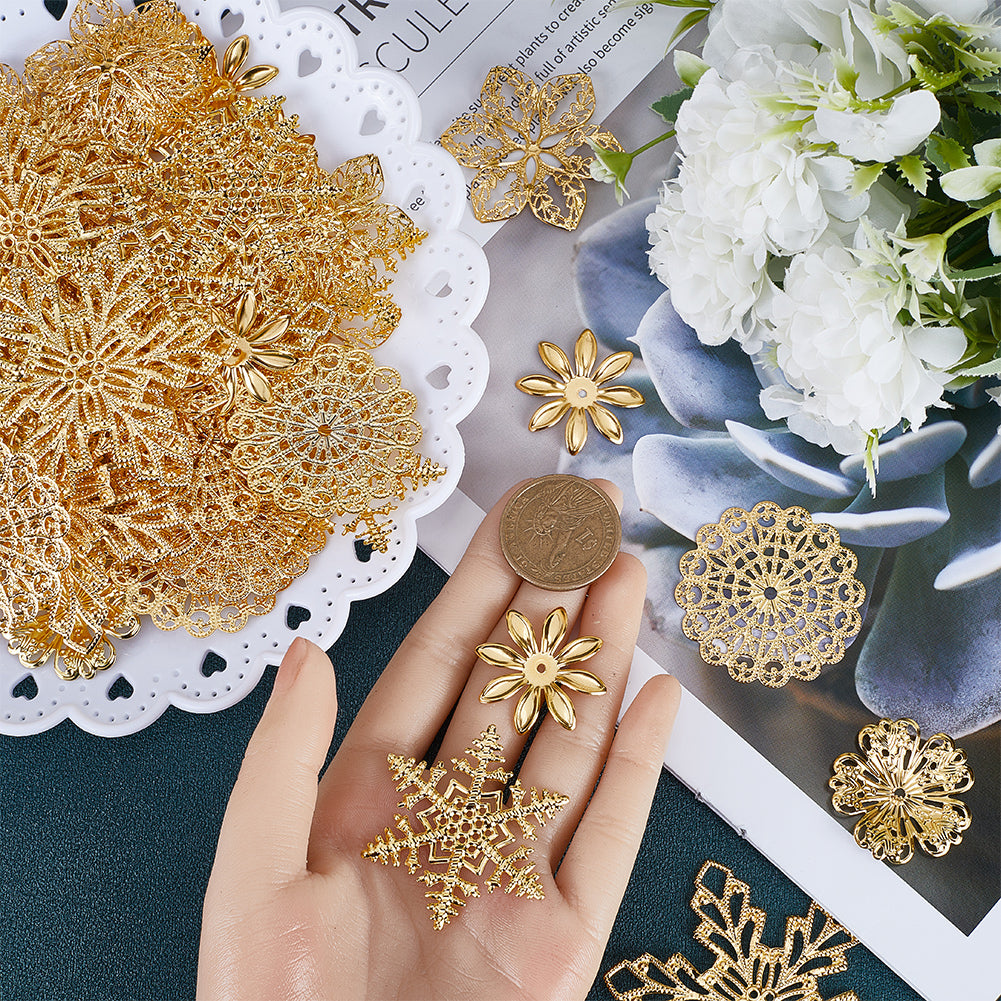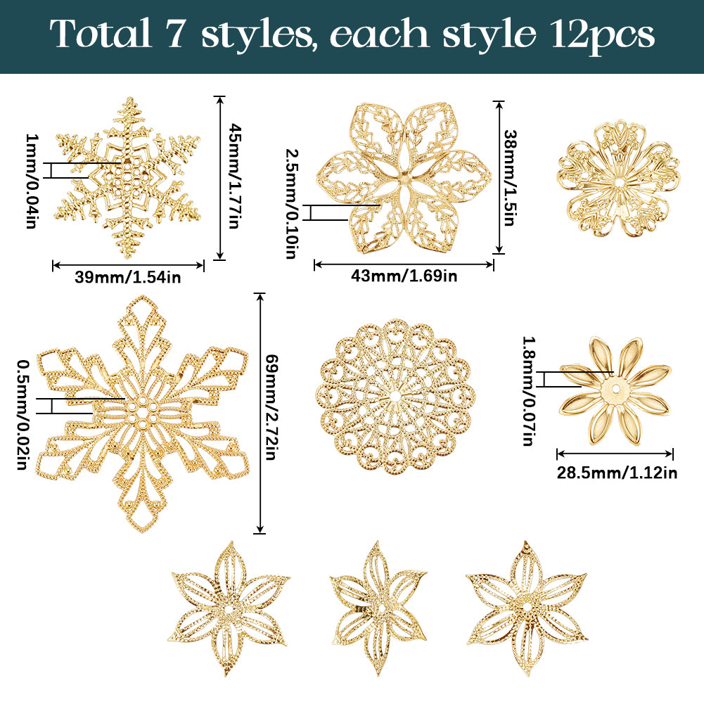 DIY Jewelry Making Finding Kit, Including 84Pcs 7 Styles Iron Beads Caps & Pendant & Filigree Joiners, Etched Metal Embellishments, Flower & Snowflake, Golden, 28~45x28.5~42x0.5~3mm, Hole: 1.5~3mm, 12Pcs/style